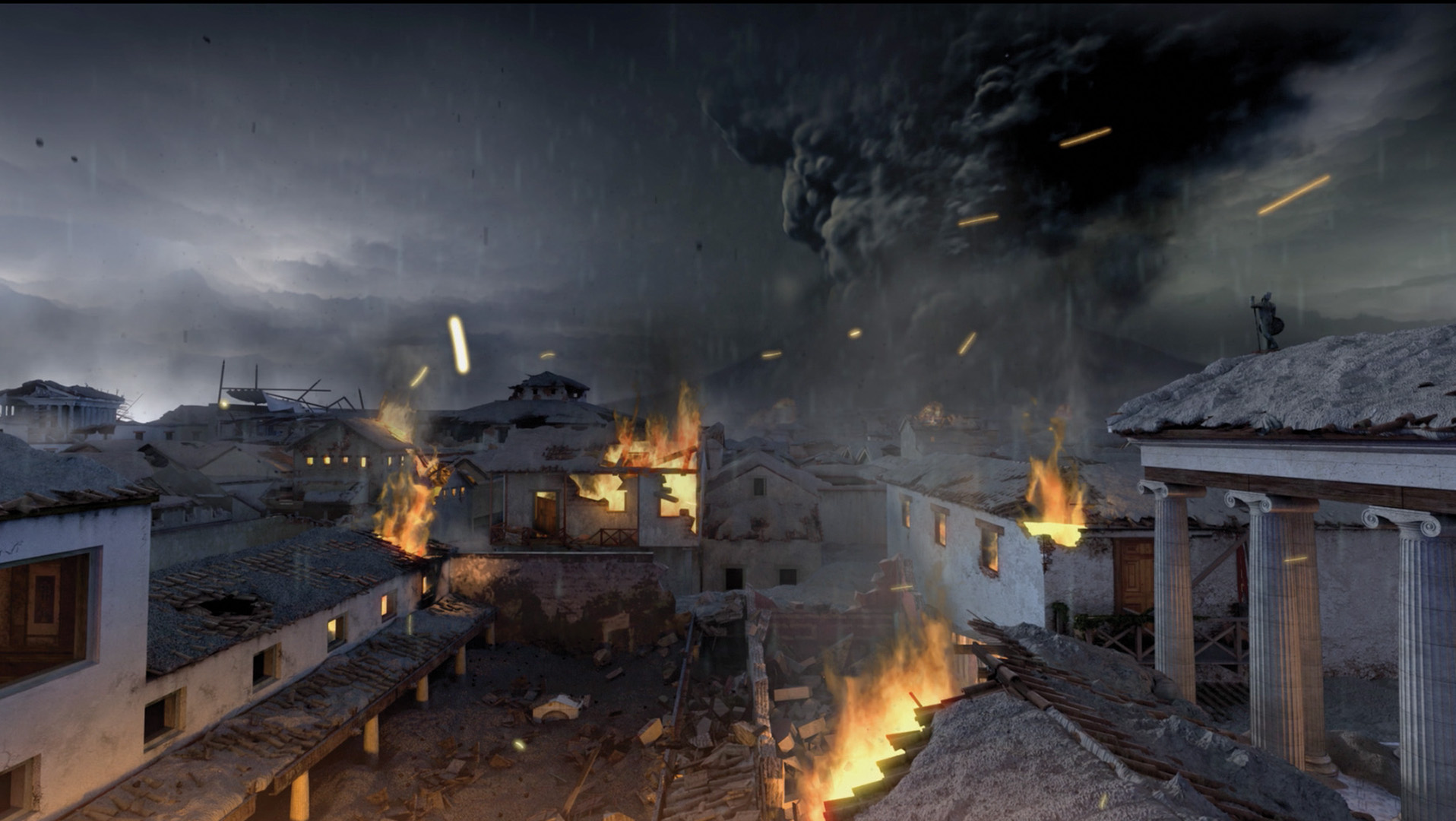 “A Day in Pompeii” is an immersive, high-definition, stereoscopic installation designed by Zero One Animation for the Melbourne Museum. It tells the story of the eruption of Mount Vesuvius and how, within 24 hours, a volcanic eruption completely destroyed the ancient city of Pompeii. Viewers are positioned in the installation as if they are actually looking out a window. For the first time, viewers can truly understand exactly how these dramatic events unfolded. Up to eight cameras were used to give full variable interocular range. This provided a stunning stereoscopic effect with huge depth and minimal eye stress, and it delivers a crystal-clear image no matter where you look on the screen. Physically based simulation software was used to destroy the city of Pompeii and create fire, dust, and volcano plumes. Most buildings were built by hand procedurally as if they were real buildings. Each tile was placed on a supporting banister, and the banisters were supported by the structure of the building to ensure earthquake and rock-strike simulations created physically accurate results. T he volcano smoke plume was simulated using physically based thermodynamic simulation software to create an extremely realistic depiction of what could have happened the night Mount Vesuvius erupted.