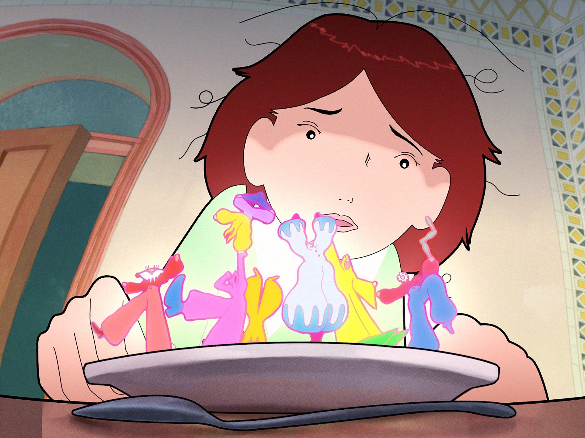 Lili and her girlfriend share a tender moment, leaving Lili blushing with a flower in her hair. Later at home, her happy demeanor drops as she hides the flower in a pocket. But it doesn’t go unnoticed by her father. His assumptions piles pressure onto Lili, causing her to hiccup, then vomit small acrobats onto her plate. These little beings run around with a joyful chaos, inadvertently disrupting the model town on the table. This ends in a romantic dance between two acrobats, revealing Lili’s secret to her father. At first the father seems compassionate, gently gathering the acrobats into his hands, only to abruptly toss them into a drawer. Before Lili can process what has happened, her grandmother arrives from the kitchen. Upon seeing the acrobats on the table, Granny reacts violently, smashing them with her ladle. Shaken, Lili vomits again, unleashing an entire wave of acrobats which floods the room. The grandmother’s attacks become more frenzied, threatening not only the acrobats, but the miniature world on the table. Terrified, the father tries to protect his model town, cowering in his seat. Lili must then intervene to stop her grandmother’s rampage. She asserts herself, and her acrobats form a circle and together create a big circus tent that fills the space. The spotlights turn on, revealing the inside of the big top, filled with acrobats performing their acts. Lili looks toward her family: her grandmother storms out of the circus, and her father timidly follows. With bittersweet acceptance, Lili lets them go, fully emancipating herself from the pressure she was under. The father finally turns back and admires his daughter.