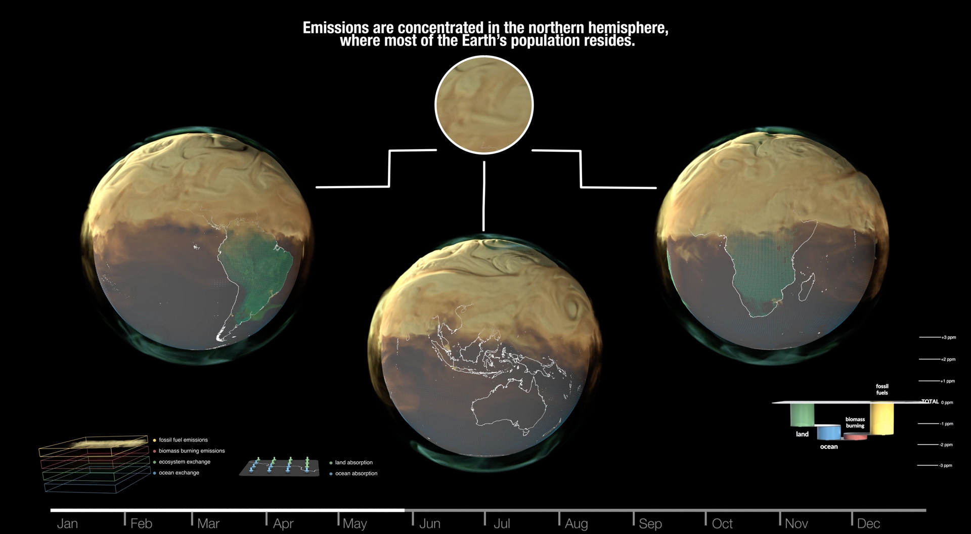 Carbon dioxide is the most prevalent greenhouse gas driving global climate change. Currently, Earth’s land and ocean carbon sinks collectively absorb about half of human emissions every year. NASA uses advanced computer modeling techniques to study the influences of sources and sinks on how carbon moves in the atmosphere.