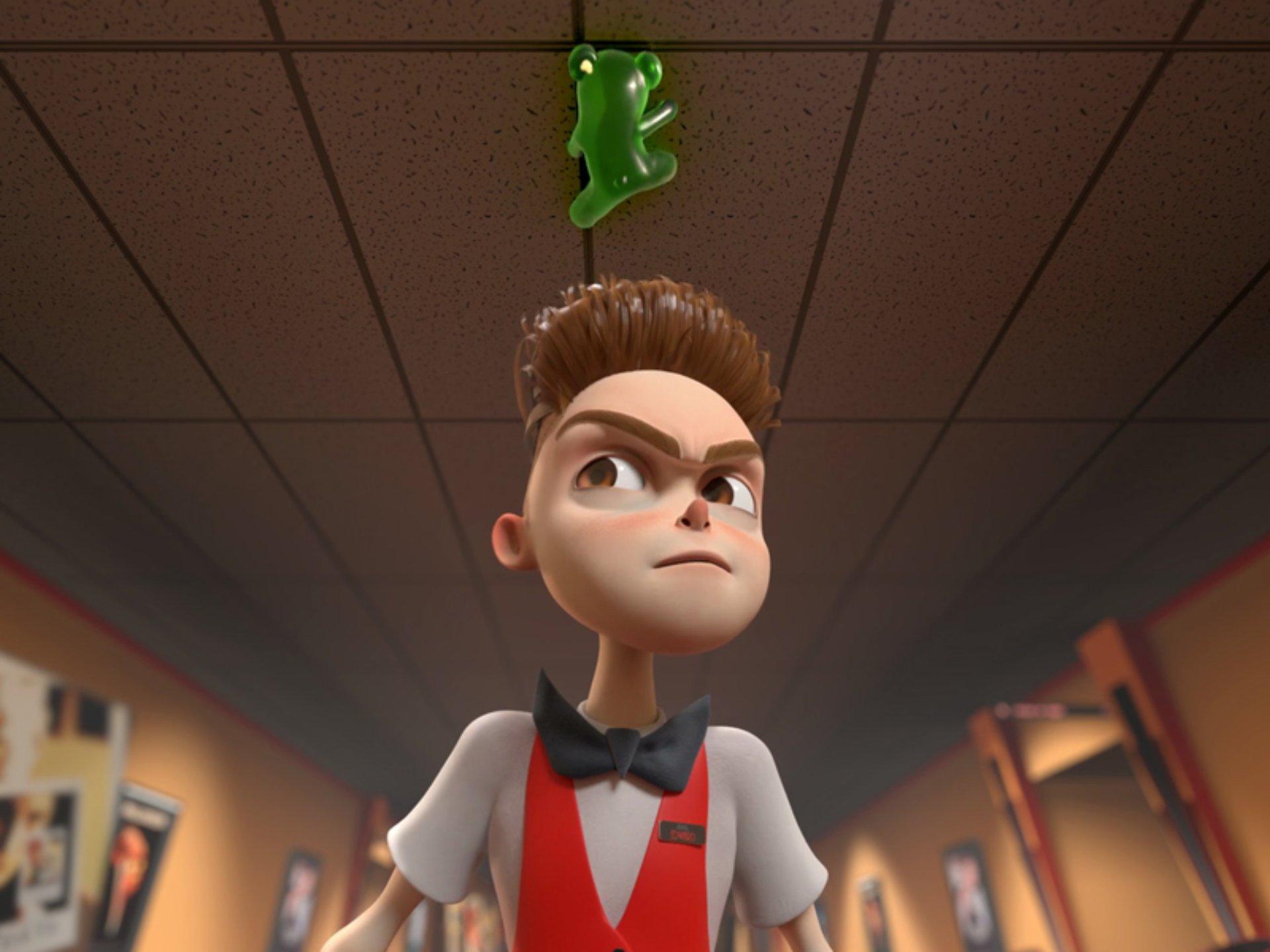 A gummy bear sneaks into a movie theater.