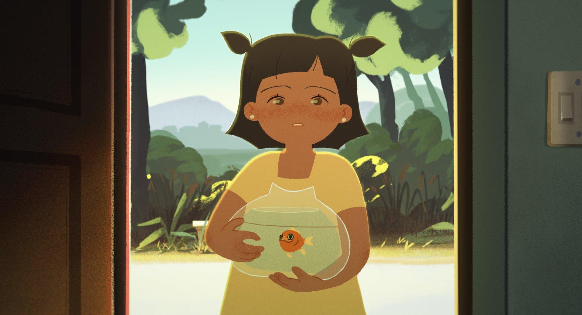 Elise, 9 yo, has to move out of her suburban childhood home. To make matters worse, as she enters her new apartment with her orange pet cat Roger in her arms, he turns into a goldfish. Horrified by the change and the lack of understanding from her parents, she refuses to accept her cat’s transformation. Elise returns to her old house along with her goldfish, thinking it can reverse the spell. She thrusts the bowl repeatedly through the door frame, to no avail. When she steps inside, she is faced with the vast and silent emptiness of the house. She goes into her old bedroom, puts the fishbowl on a dresser, and breaks down in tears when she sees her and Roger’s old drawings on the wall in his cat form. While she pleads for her cat to return, Roger meets her in a ghostly cat form. When Elise tries to hug him, he runs out of the room. Elise tries to follow him but, in her hurry, she stumbles and catches the dresser to regain her balance. The fishbowl dangerously tips over. Elise hesitates but seeing her cat disappear by the stairs, she runs out of the room, letting the fishbowl fall to the floor. Downstairs, she is confronted with ghost versions of her family and herself in nostalgic scenes of her daily life in this house. However, this dream soon turns to a nightmare; the ghosts start acting aggressively towards Elise and forcing her to stay with them. They chase her and Elise falls into a deep void, trying to escape. She notices Roger’s limp fish body by her feet surrounded by the glass shards of the fishbowl and breaks down out of sadness.