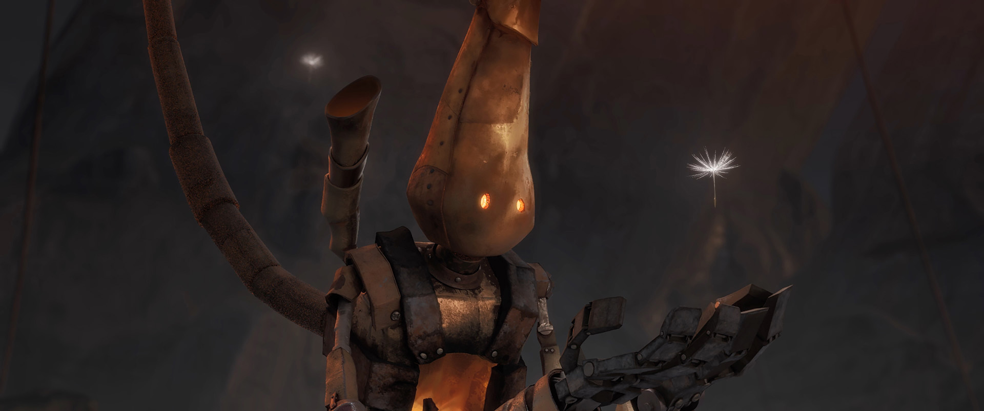Acoal-burning robot working on a mine finds a dandelion.