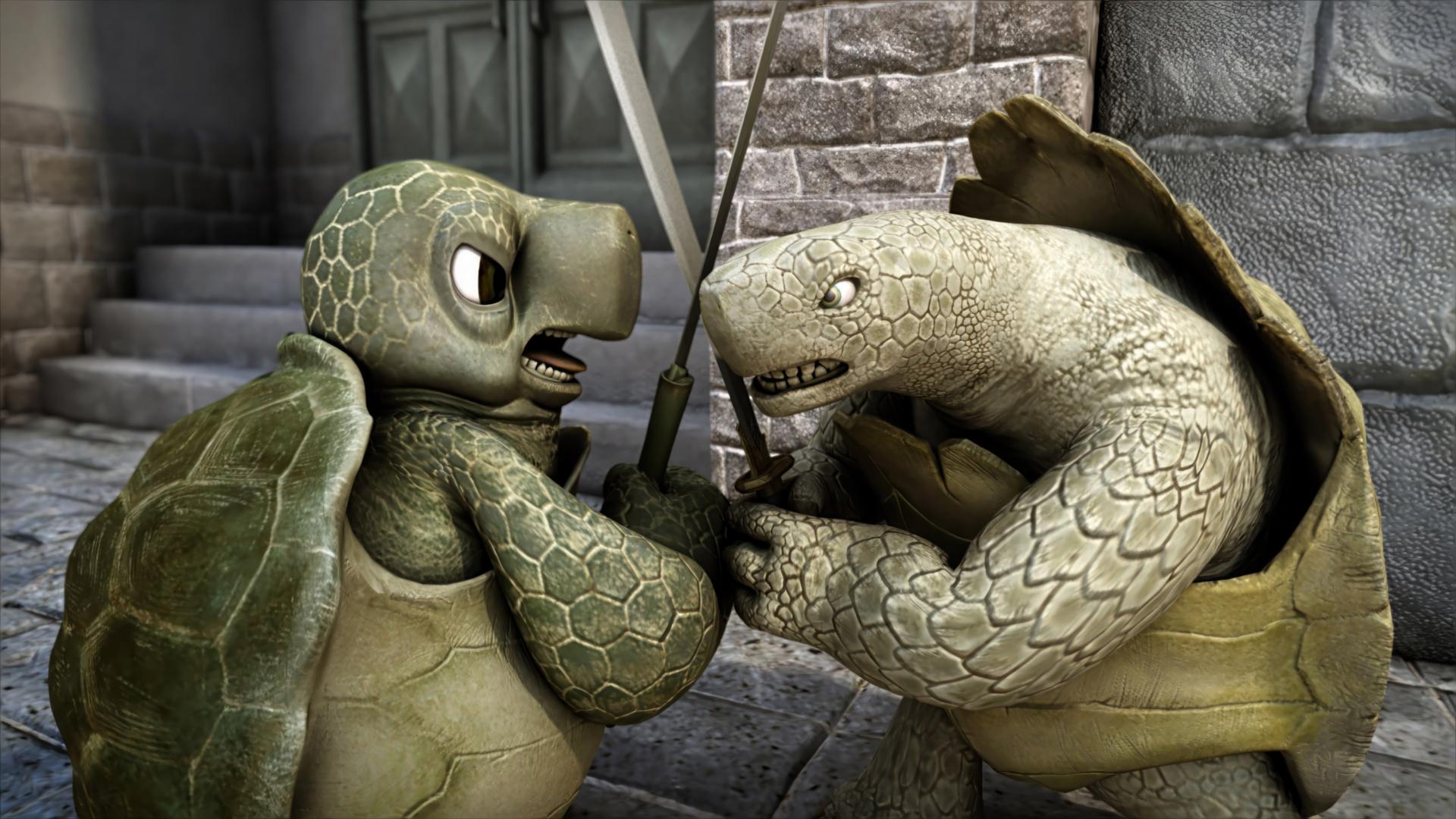 Two turtles are making a living as performers on the street. Suddenly, all the money they have earned disappears, so they turn on each other and fight. However, they do not know that the money was stolen by others.