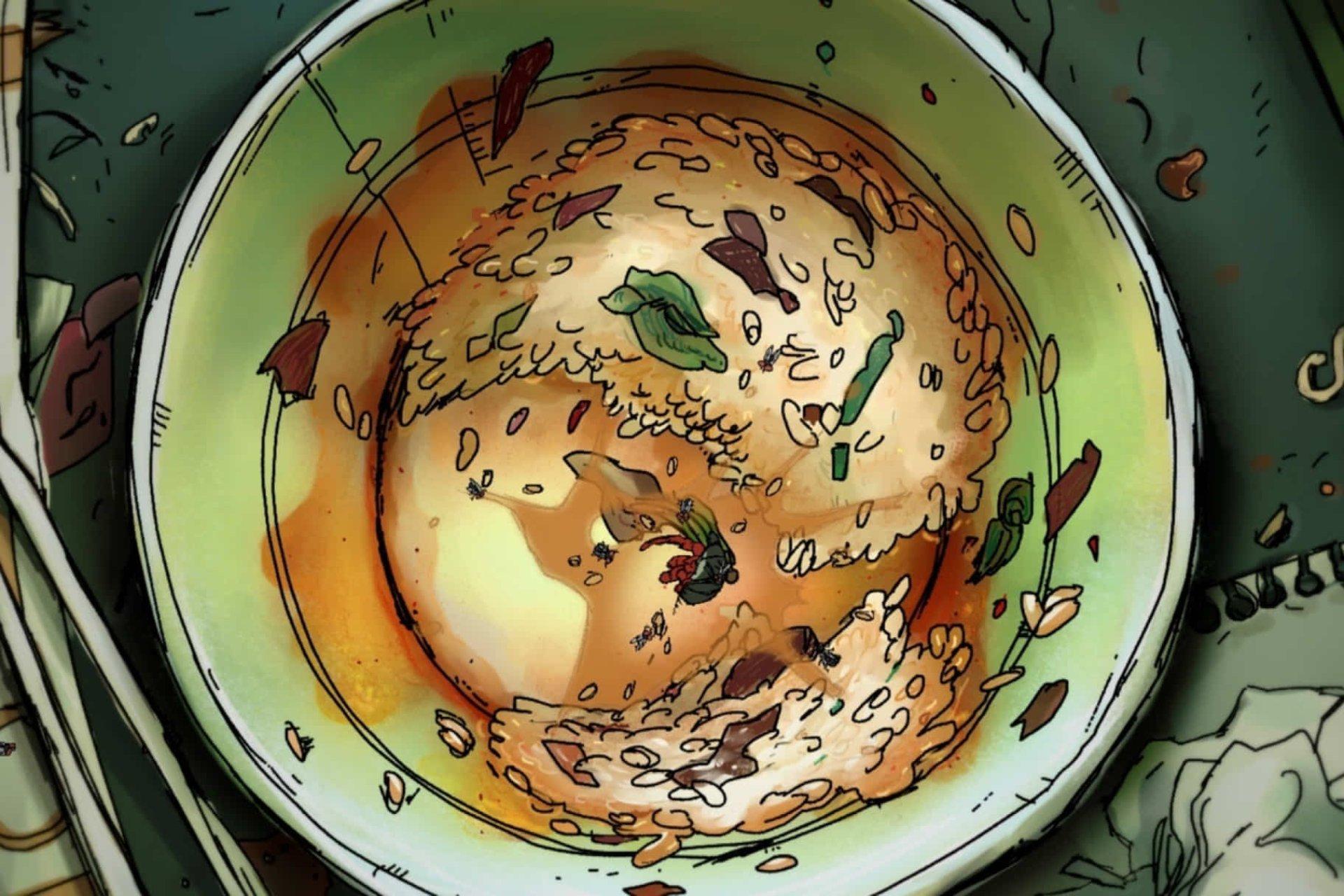 She is eating convenience food as usual when she senses a strange texture and learns that it was a fly. Soon, she is plagued by anxiety from believing that the fly is living in her stomach and makes all kinds of efforts to digest the fly.