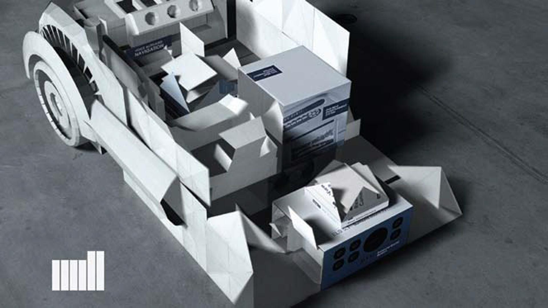 The spot opens outside a contemporary building, where a man is wheeling a dolly loaded with what appears to be sleek, high-tech boxes. The man places one box onto the pavement, and it begins to unfold as if it were a piece of living origami. As each box is placed down, one joins the other in an animated origami style until together they form a life-size Acura MDX.