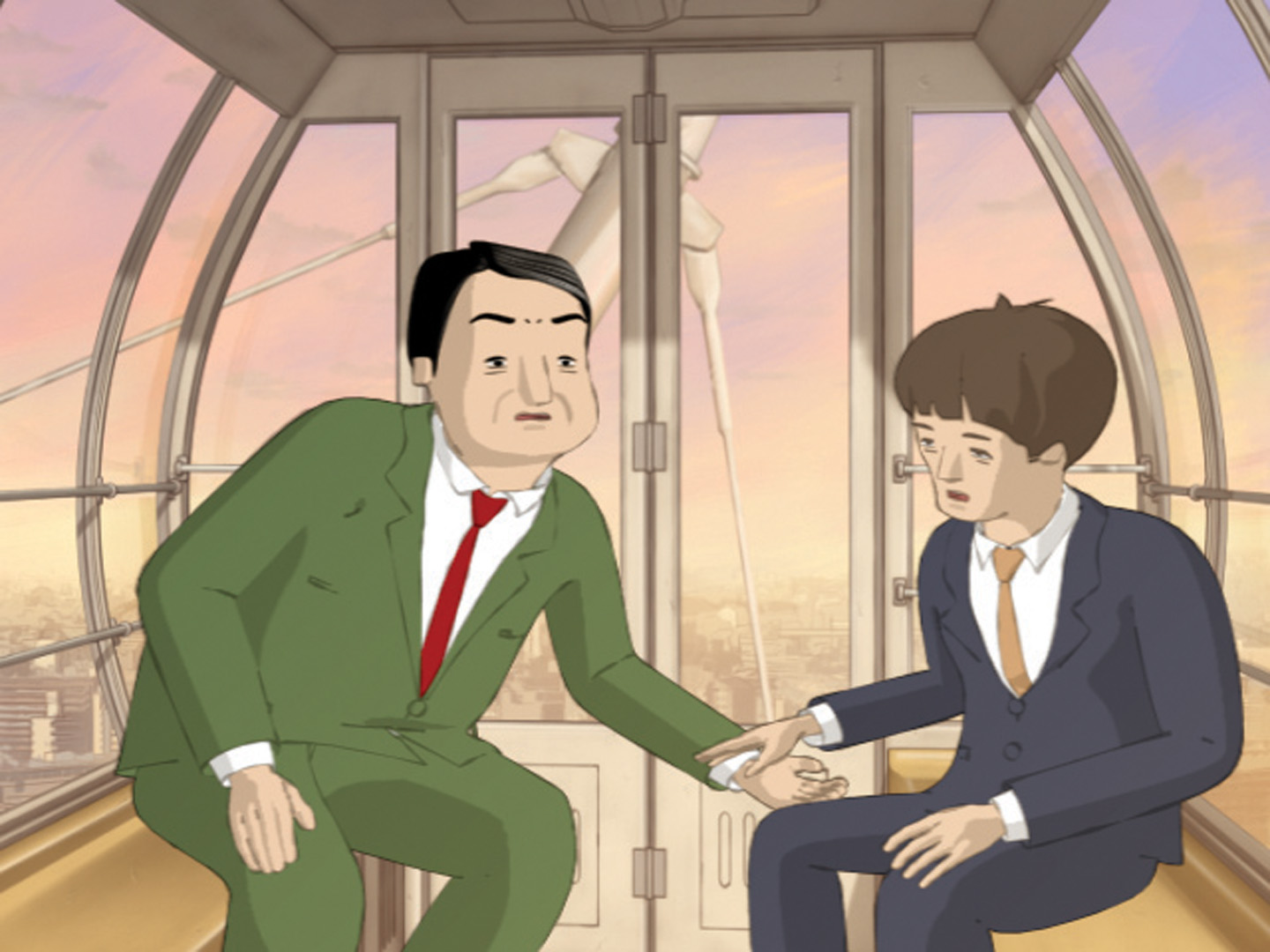 As a chief manager and his employee are riding a ferris wheel, it looks like the manager is receiving important advice.