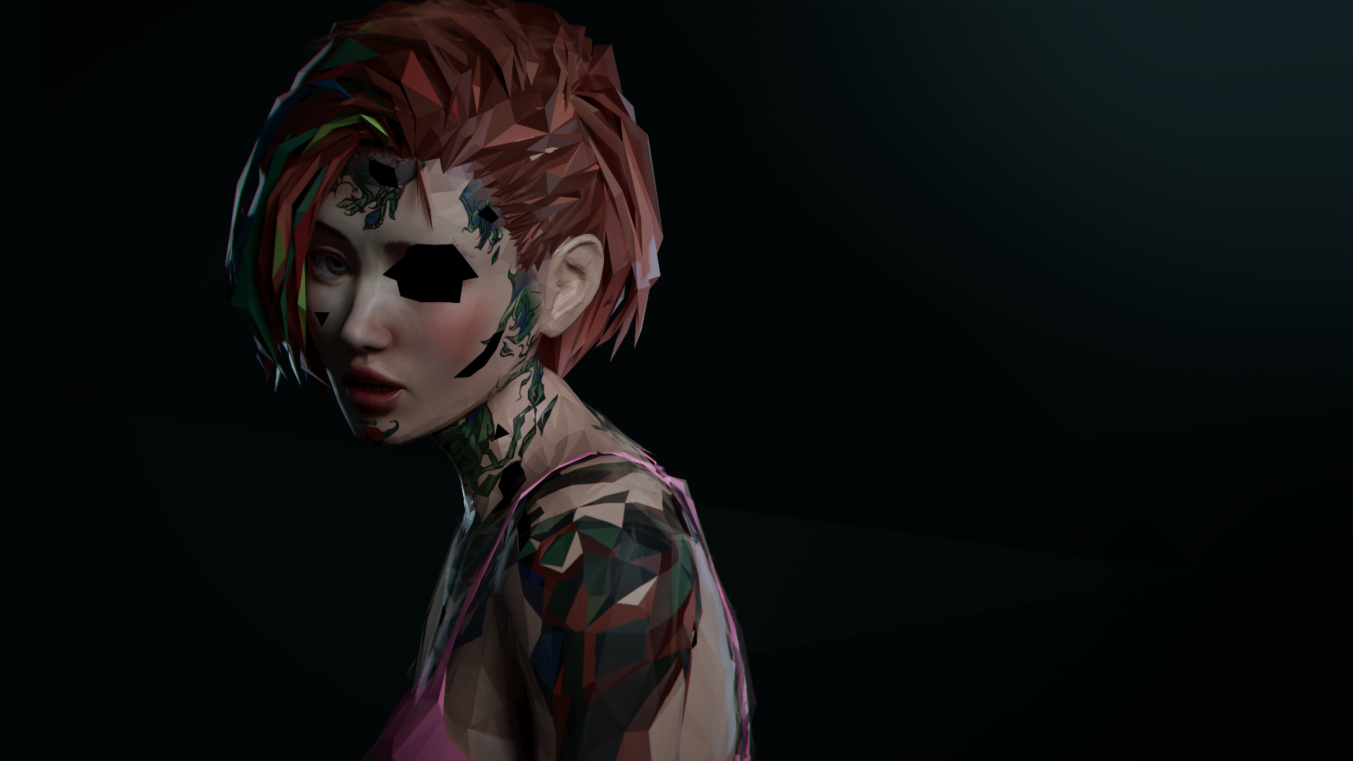 This work visualizes how people focus on what interests them by adjusting 3D model polygon counts—high for key facial and hand details, low elsewhere. Camera focus shifts similarly, with translucent polygons blending character and background to avoid emphasizing low-detail areas.