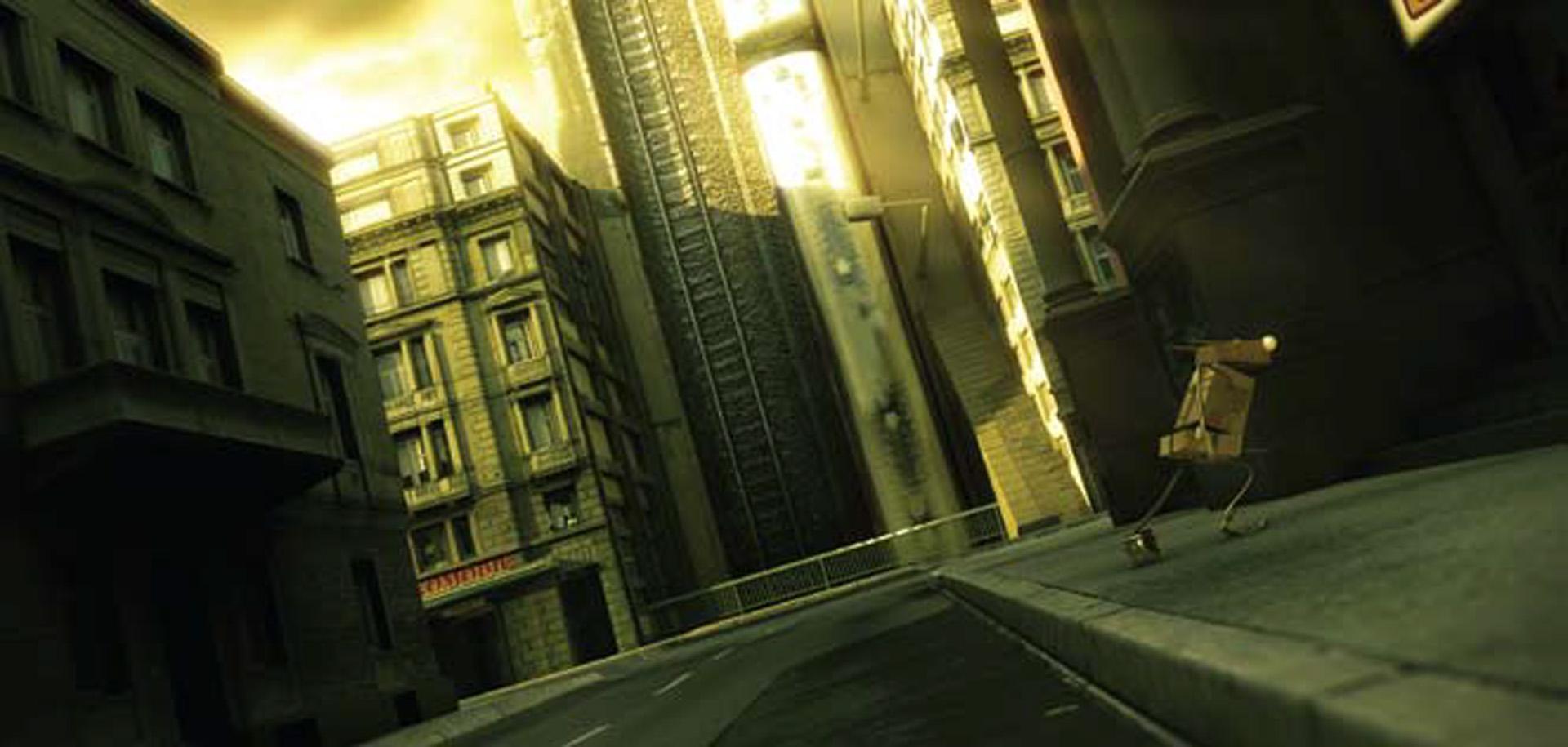 A strange character built out of a fish, a pot, and some boxes runs through a completely messed up Stuttgart to reach the cinema just in time for the international Stuttgart Festival of Animated Film.