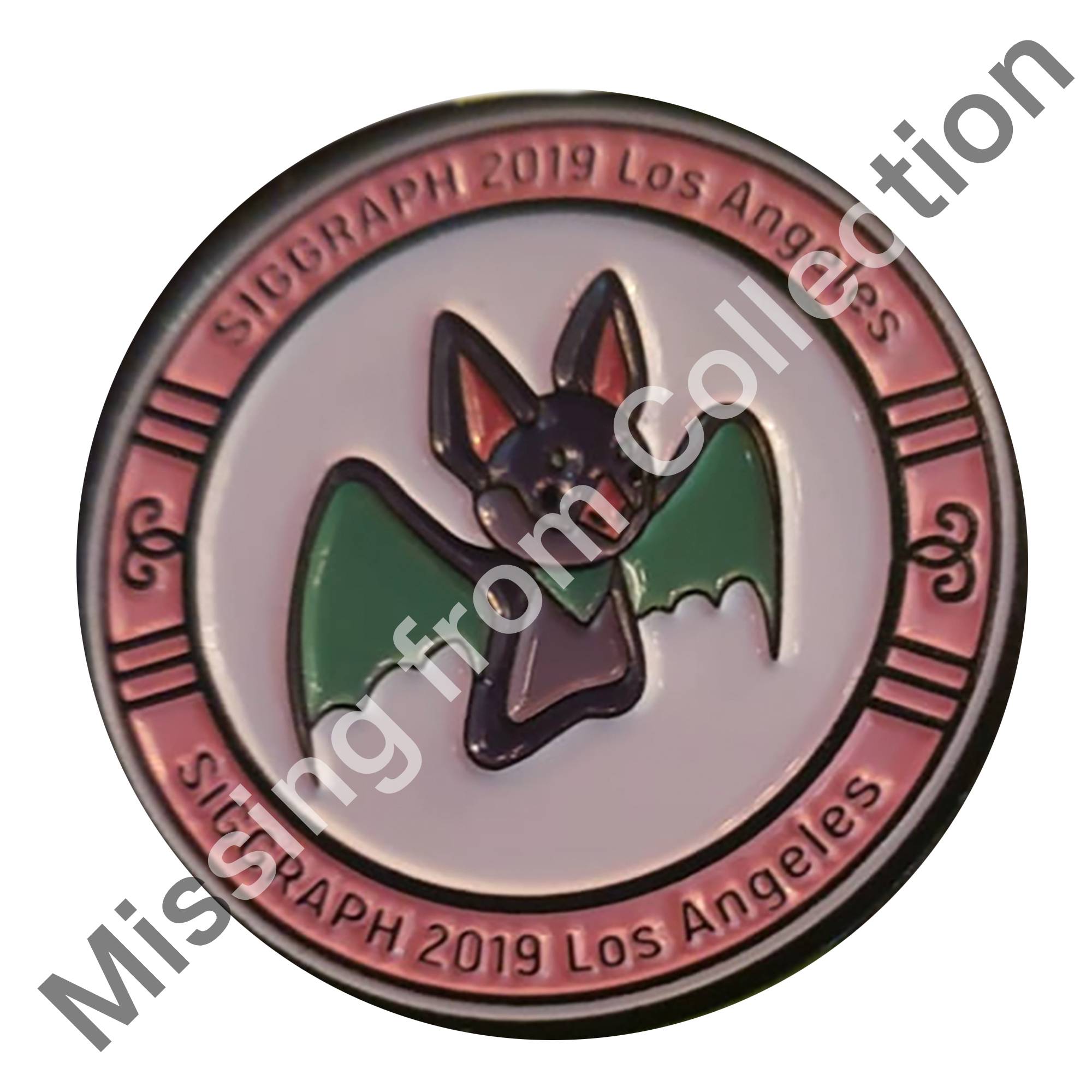 Round pin with pink border and white center. In the middle there is a bat with green wings. In the border it says “SIGGRAPH 2019 Los Angeles” on the top and bottom. Part of a scavenger hunt.
