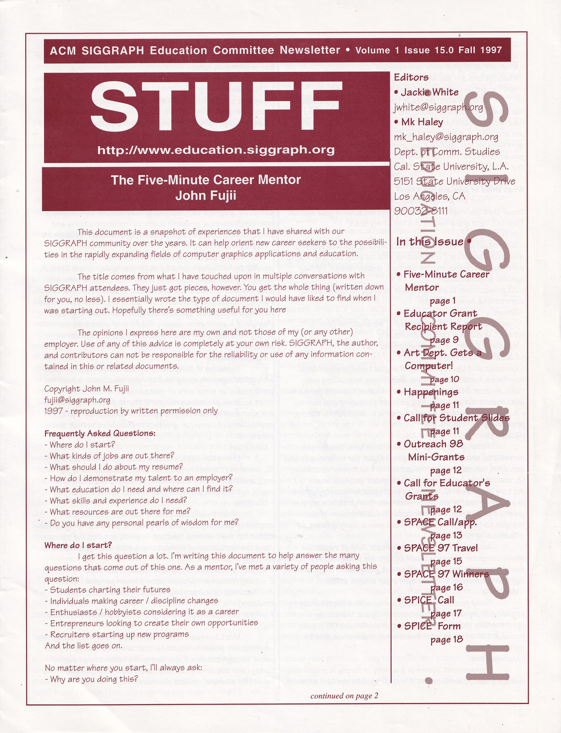 “STUFF: ACM SIGGRAPH Education Committee Newsletter”, Fall 1997, Vol. 1, No. 15