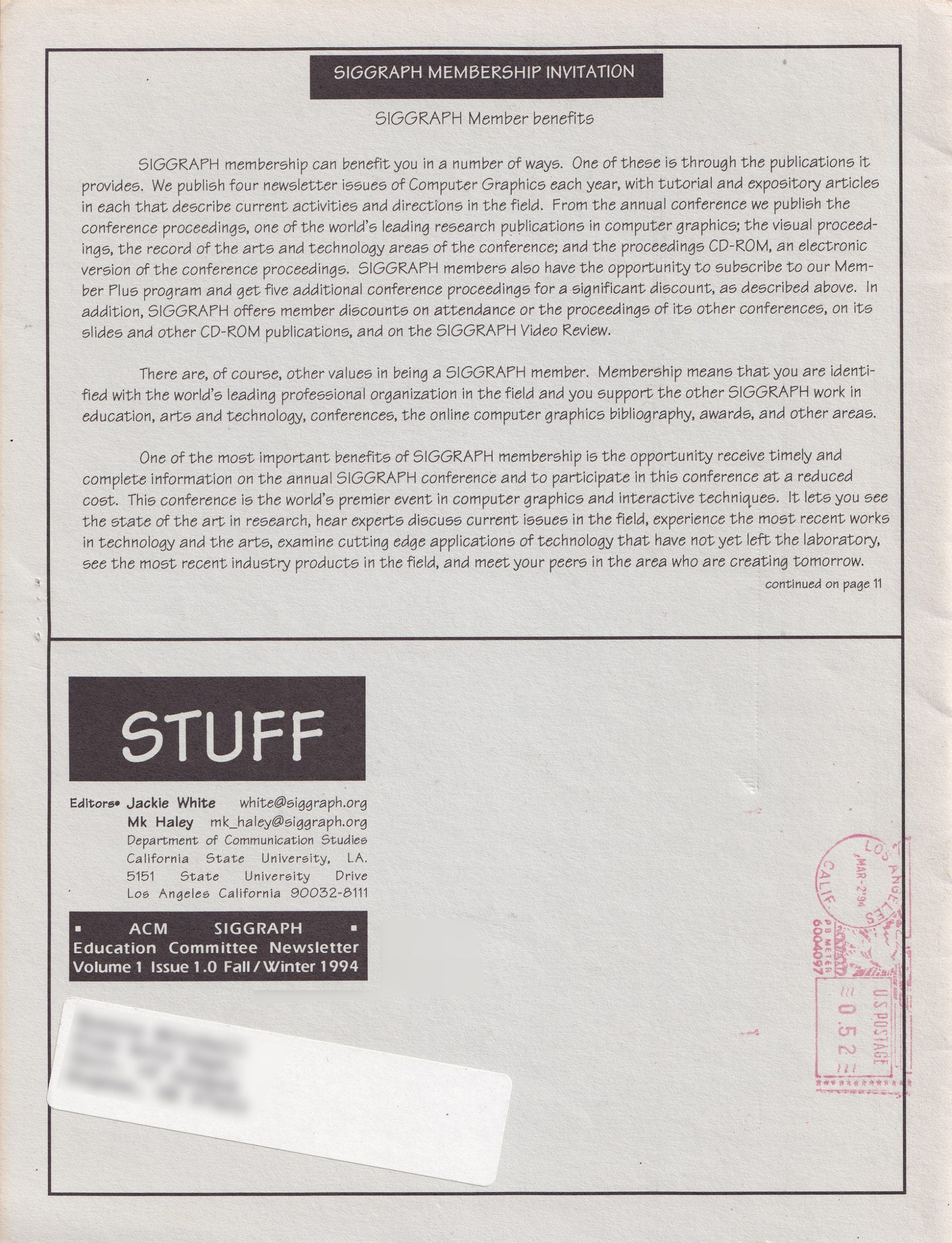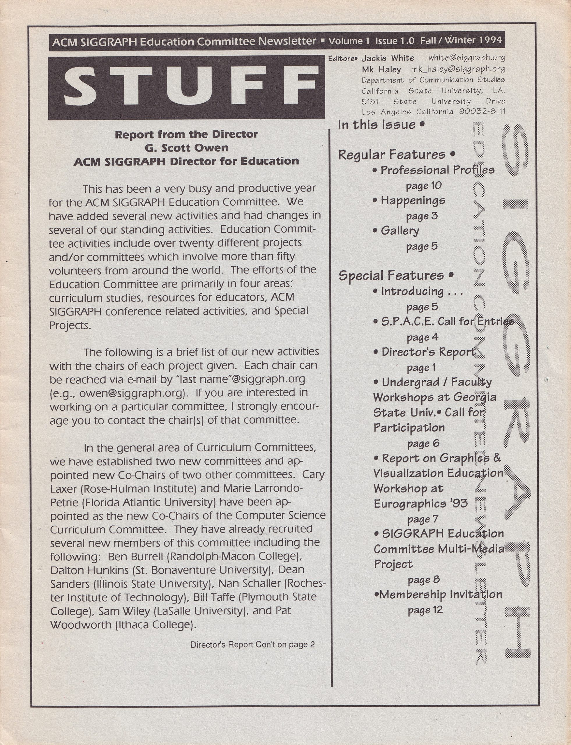 “STUFF: ACM SIGGRAPH Education Committee Newsletter”, Fall / Winter 1994, Vol. 1, No. 1 – ACM SIGGRAPH HISTORY ARCHIVES