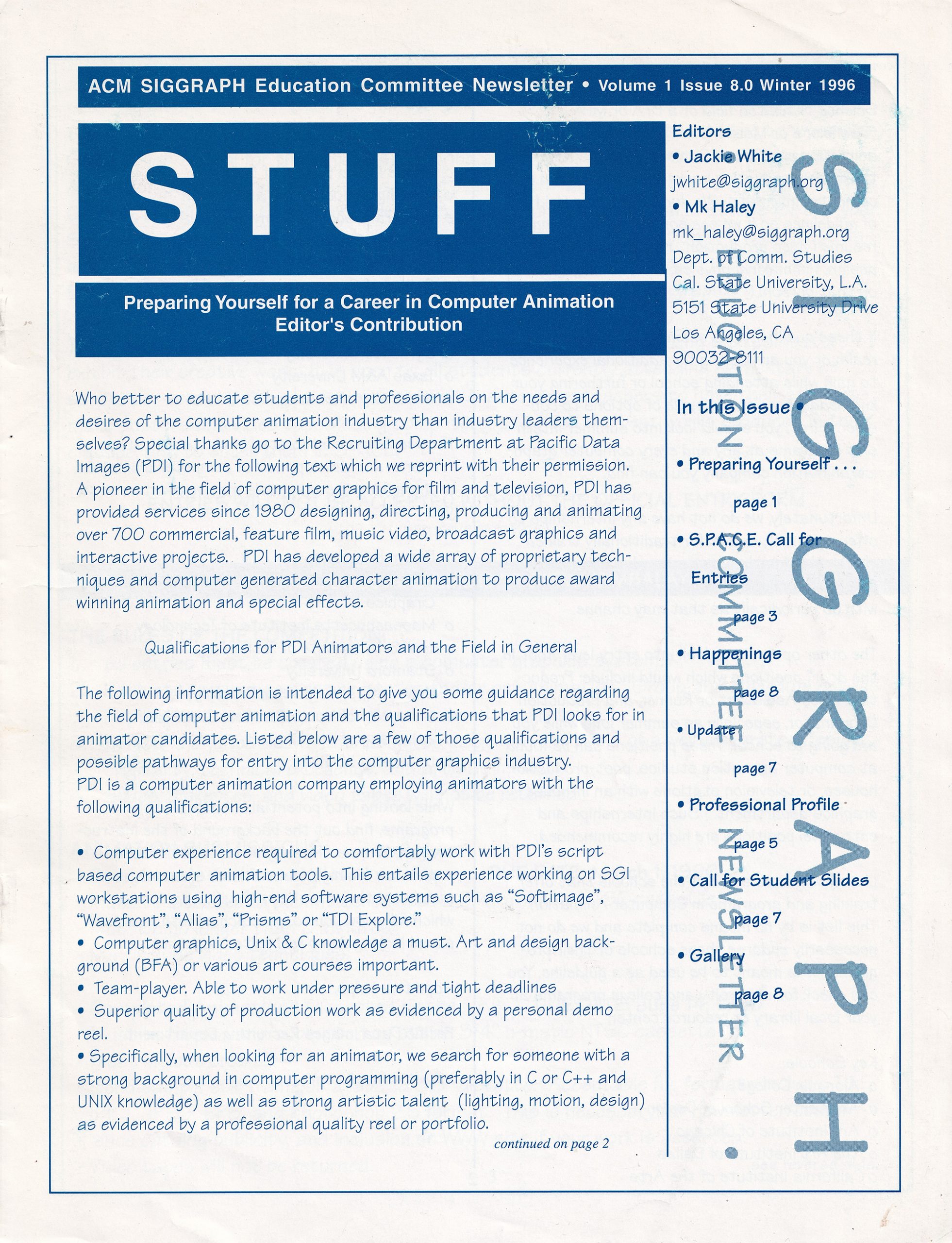 “STUFF: ACM SIGGRAPH Education Committee Newsletter”, Winter 1996, Vol. 1, No. 8