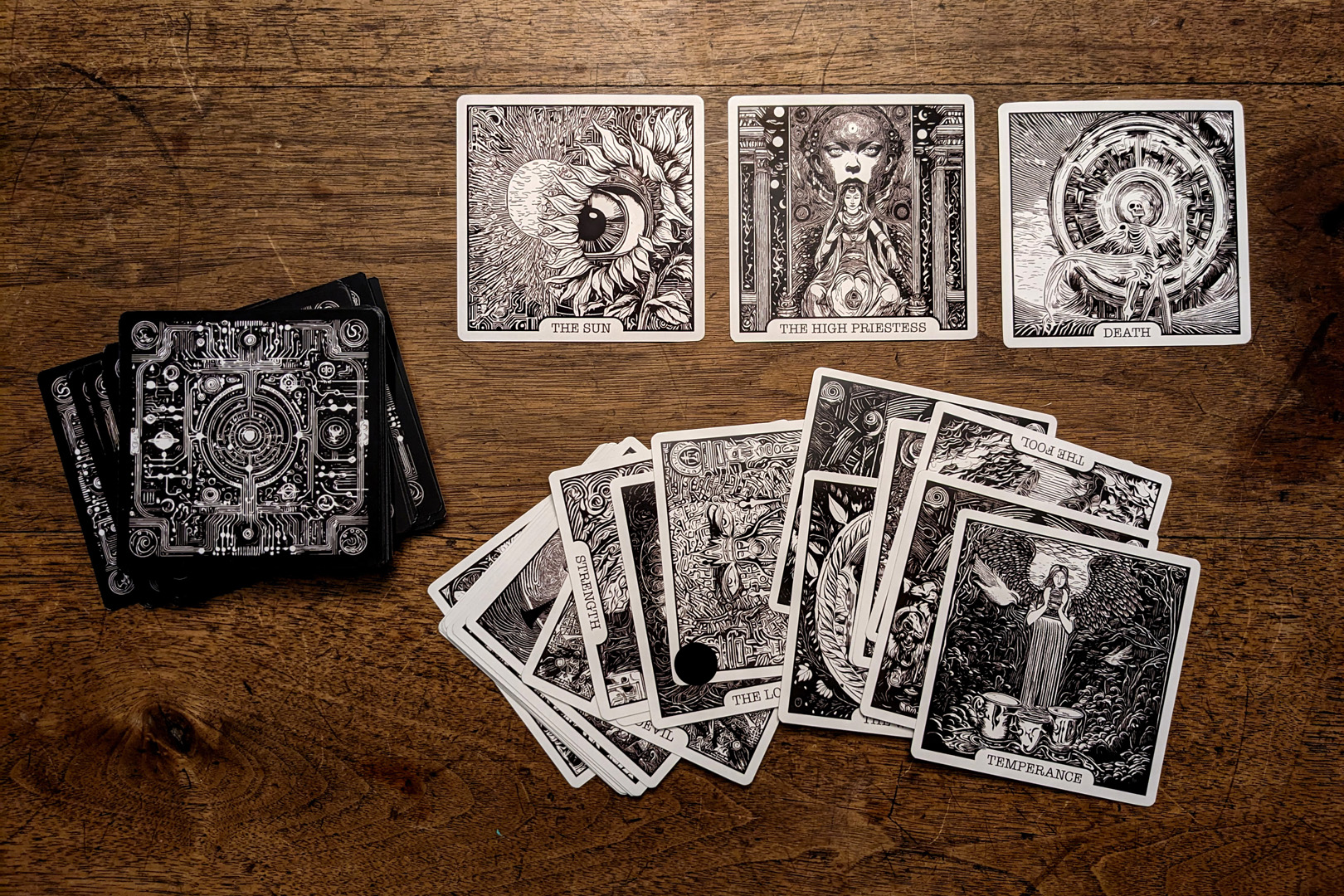 Do Large Language Models produce the truth or technological hallucinations? Cybernetic Oracle invites visitors to use cartomancy to gain insight into their past, present and future with a deck of 78 tarot cards and a book of tarot card interpretations designed by the artist in collaboration with generative AI models. The symbolic nature of tarot cards to emphasize generative AI?s predisposition for archetypal representation. The work questions Large Language Models’ understanding and interpretation of reality drawing parallels between querying a generative AI model for information and divination.