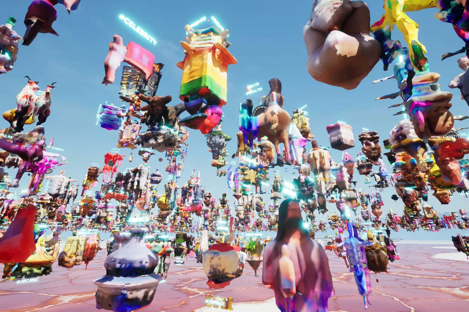 #dump and AI Fossil. #dump is a live simulated online and VR environment. Ramos and Wu tagged AI generated 3D models with matching keywords from the book Keywords for Today: A 21st Century Vocabulary (2018). Once these keywords are found in new tweets, in real time, #dump will dump the relevant 3D models into the virtual landscape of a salt mine. Hinting at activities of extraction and expansion, the 3D models will continue to ‘landfill’ the landscape, a metaphor of how digital technology will colonise every facet of our lives.