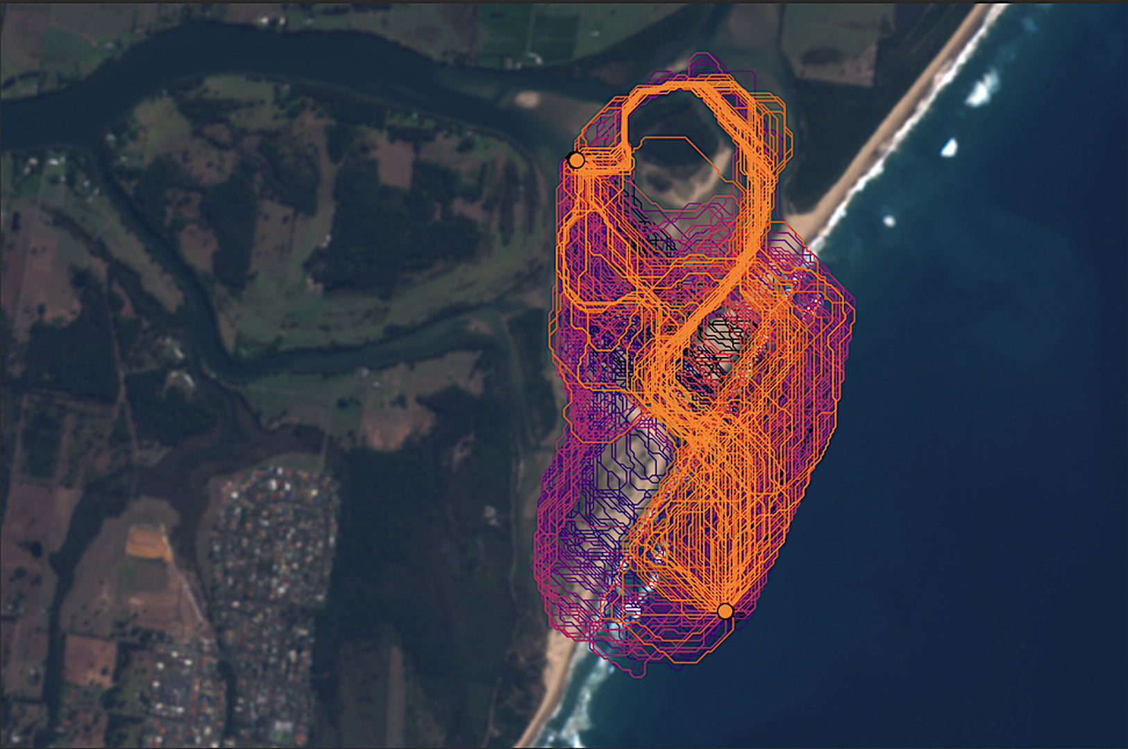 Working in close partnership with WRL postdoctoral researcher Dr. Tino Heimhuber, Helyer employs audio-visual media to rein- terpret data charting the unique dynamics of intermittently closed and open lakes and lagoons (ICOLLs). ICOLLs are the most prominent type of estuaries found on the NSW coastline and are unique in that they alternate between open and closed oceanic entrance conditions, driven by the dynamic interplay between oceanic and land-based forces. The fluctuations of water flow act as ’canary in the mine’ indicators – reacting dynamically to our increasingly kinetic weather systems.