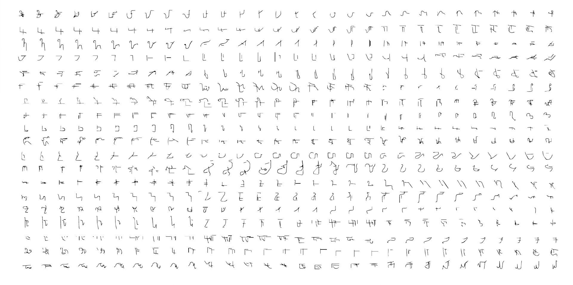 Letterform (2017) is a series of A.I.-generated letters that explore the limits of written language systems to the point where they break down beyond the compromised inherited structures of computation. Each form was generated with a recurrent neural network (Google?s Sketch RNN model) trained with an input of a database of written world alphabet letters, mainly Indigenous and non-Western, to produce new letters as memorials of what is lost, mediated by programmed code languages, then coded into machine intelligence. The forms contain hundreds of artifacts from tracing alphabet letters as vector points, to stroke-based drawings as ?handwriting,? training the computer to remember languages other than Roman English, over one million times, with intelligence to generate new letterforms. The A.I. model generates new letterforms, understanding each vector point as a squiggle, creating emergent and disobedient forms open for intepretation.