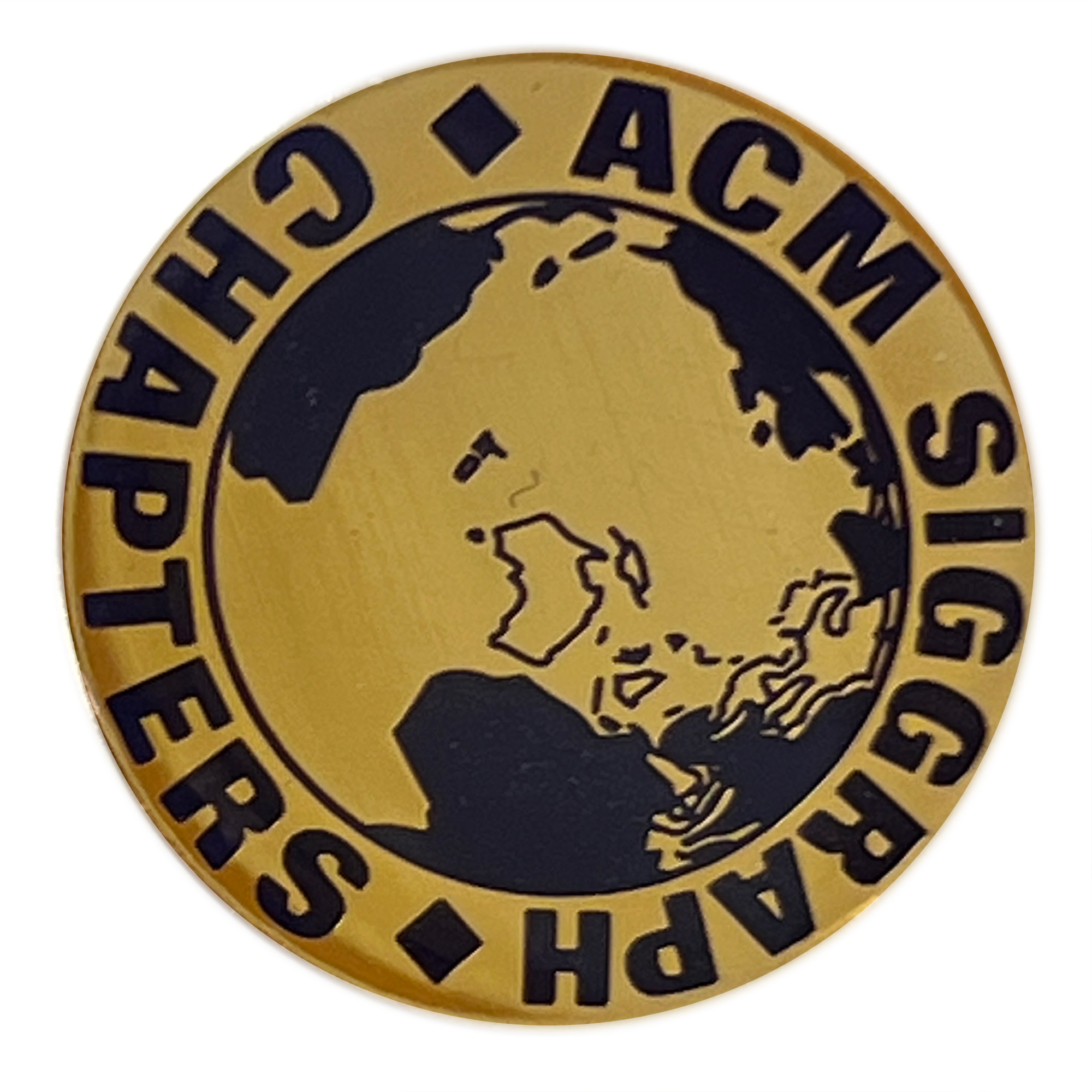 Circular gold pin with blue text that says “ACM SIGGRAPH Chapters” and has an image of the earth in the middle.