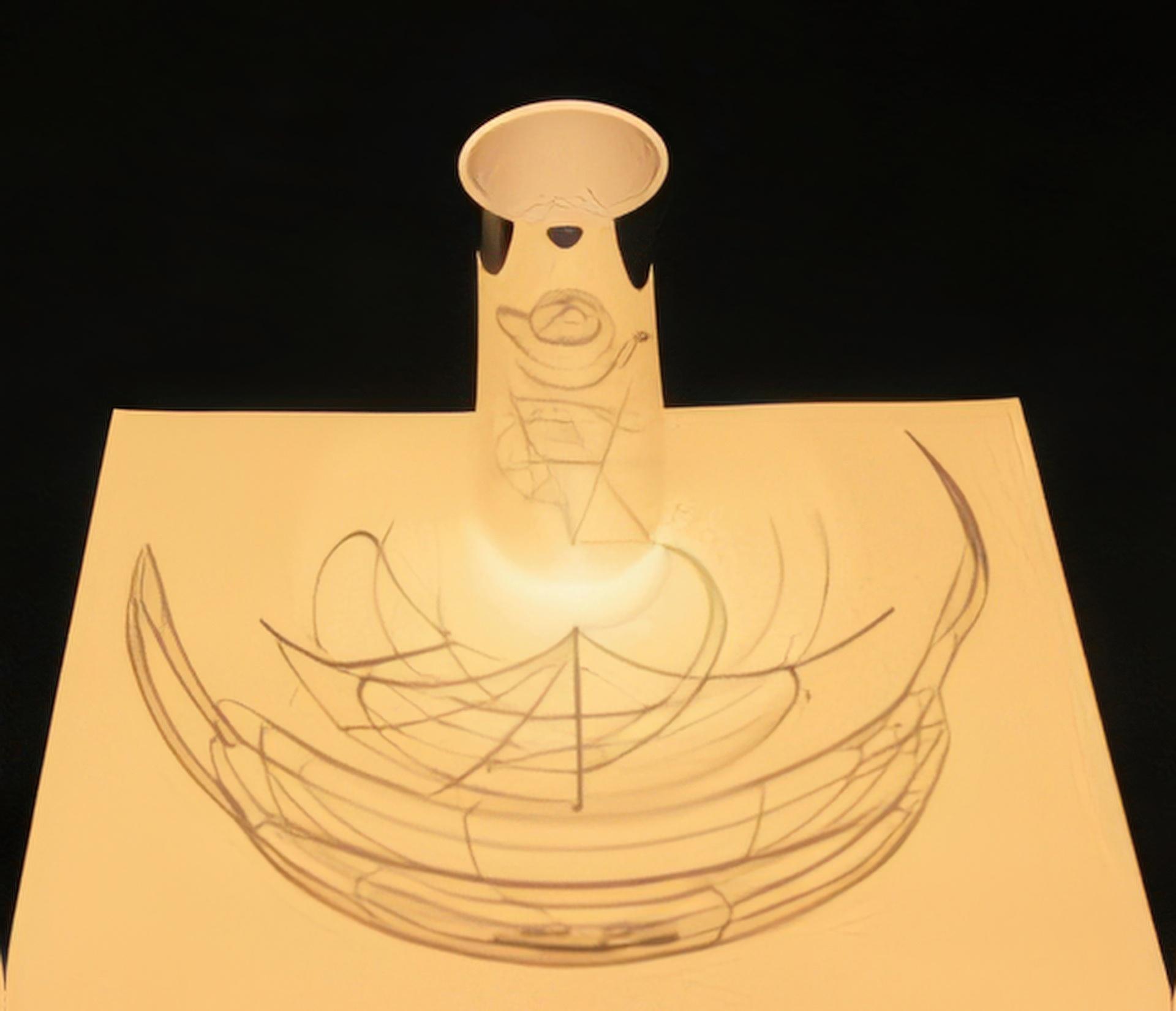 A cylindrical catoptric anamorphic image, combining a diagram from Vaulezard’s work with a distortion of the Utah teapot. Through the process itself, straight lines of light unfold in curves, in a shape that ressembles the teapot in its minimalist wireframe representation.
