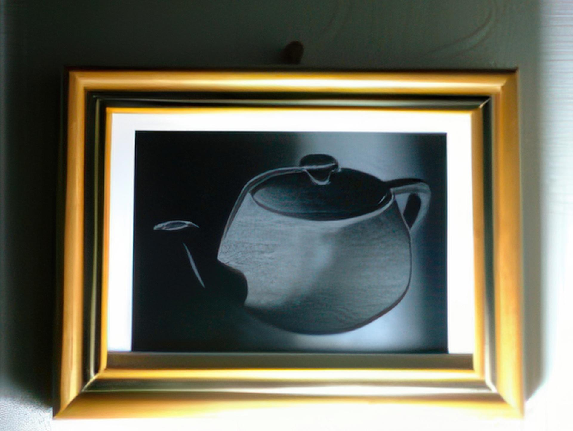 A terribly scratched teapot is a piece of scratched flat sheet. When the sheet is illuminated, a teapot appears, and observers perceive a three-dimensional surface as the specular reflection changes. This “scratched 3D” technique creates a three-dimensional appearance on nearly flat sheets such as plastic films. It generates anisotropic reflection by forming scratches that refer to three-dimensional information modeled in the manner of computer graphics. The result is a three-dimensional appearance in arbitrary curved surfaces on real-world surfaces without holography or lenticular technology. Technical Overview A terribly scratched teapot was modeled as an ordinary teapot. The Z-buffer of the teapot was taken instead of RGB color channels in the rendering process and transformed into a gradient field in the diagonal direction. Then several small curved lines ware drawn using a method called “hedge hog illustration” that makes each curved line follow the direction defined at each position of the gradient field. The binary image of curved lines was substantiated as scratches on a metal plate using a photo-engraving plate-making system. Copies that reproduce the 3D appearance can be easily made with an embossing process.