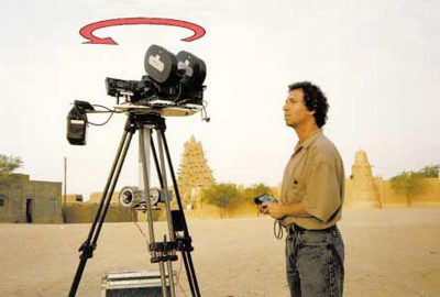 The camera system deployed two 35mm motion picture cameras (for high spatial resolution) mounted side-by-side (for stereopsis) with wide-angle lenses (for immersion) and synchronized 60 frame-per- second motors (for high temporal resolution), which generated unrivaled fidelity. The system was mounted on a motor-driven tripod that rotated once per minute. The entire system weighed 500 pounds but was built for travel.