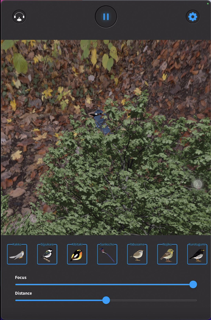 Bird listening is an application to find and appreciate 10 types of wild birds by using spatial acoustic bird sounds. When the user faces the direction of a bird’s call and holds a digital device in front of them, the bird appears through the leaves of the tree.