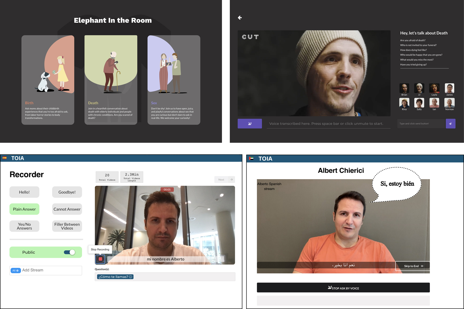 We present novel web applications that blend AI and video communication, offering an interactive way to engage with videos, transcending time and distance constraints. Known as Time Offset Interaction Application (TOIA), the platform transforms passive video viewing into dynamic conversations using personal recordings or YouTube clips. Our work expands TOIA with two unique experiences: 1) “The Elephant in the Room” project, stimulating dialogues on sensitive topics like childbirth, sex, and death; 2) Support for multilingual interactions, fostering a global collection of diverse personal narratives. Through AI and interactive media, we aim to broaden the horizons for sharing human experiences and perspectives.