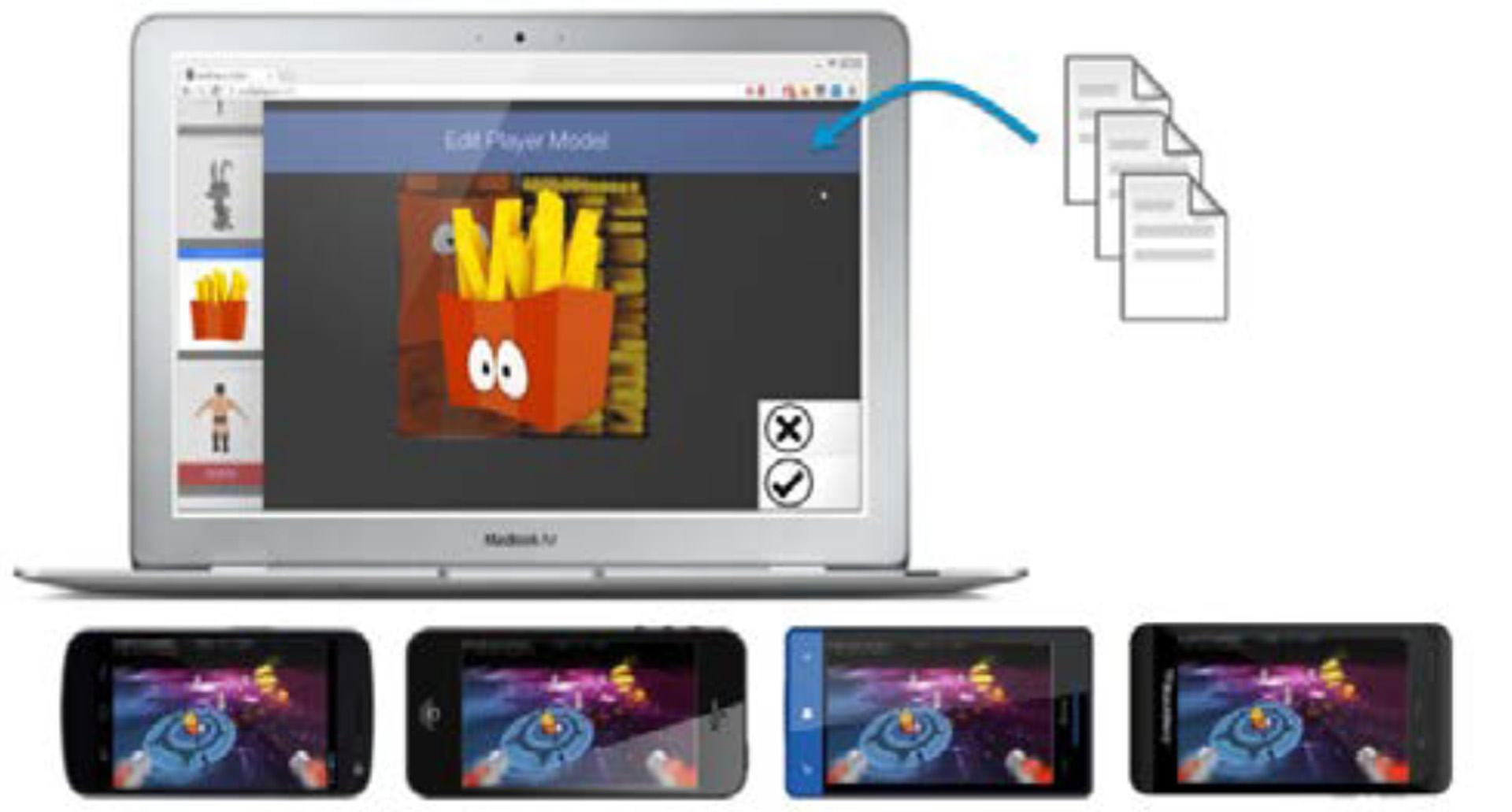 Drag, drop, edit, 3d models, levels, UI and source code in real-time across iOS, Android and Windows Phone.