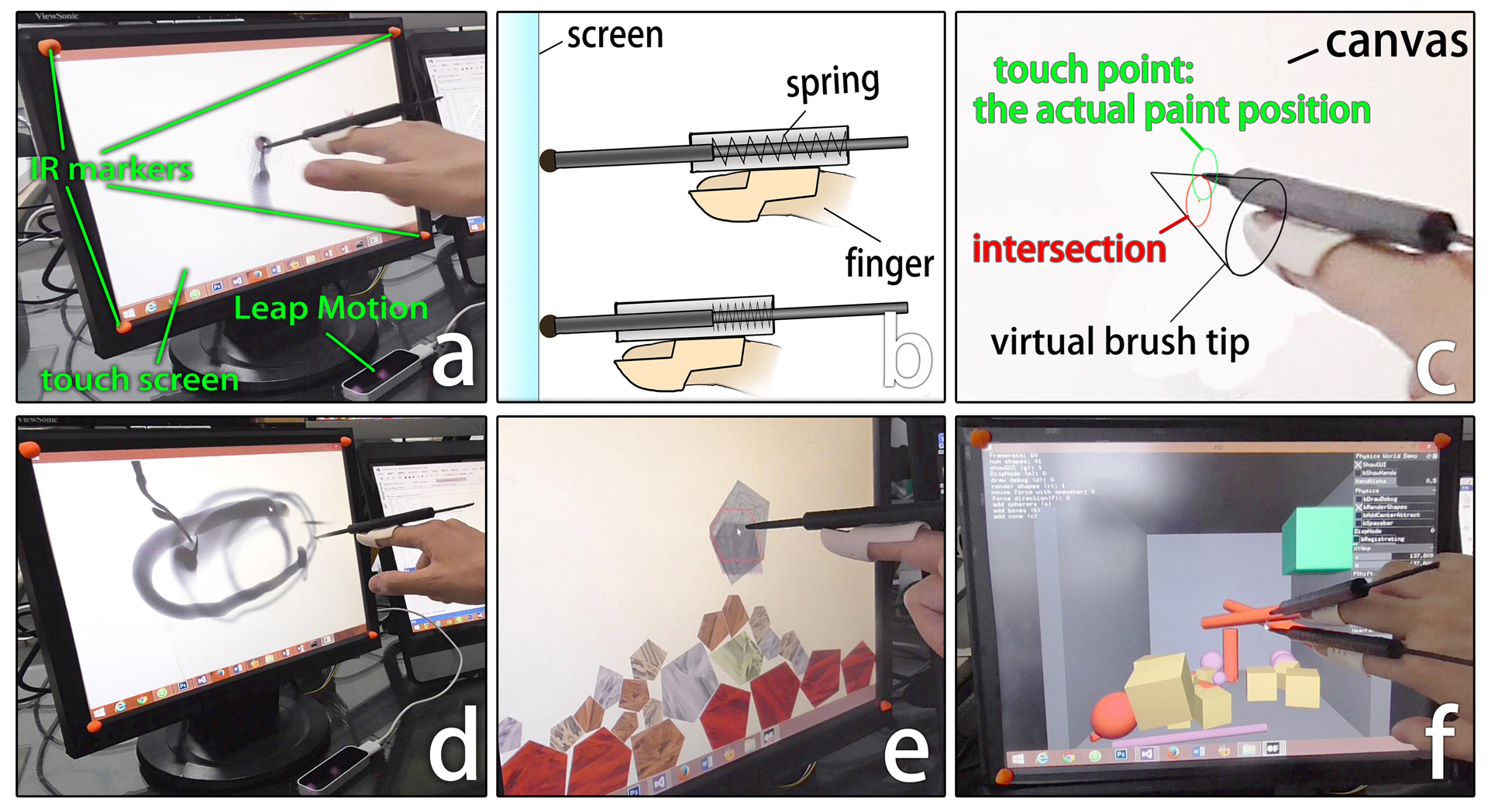Recently, the use of digital styluses is challenged by air painting applications such as Painter Freestyle [Sutton 2013], Ethereal for Photoshop (http://drivenpixels.com/ethereal), and Fantasia Painter (https://apps.leapmotion.com/apps/fantasia-painter/windows). By utilizing the hand tracking capability of Leap Motion controller, these applications show that painting in the air using hands movement is much more flexible in artistic improvisation due to high degrees of freedom (DoFs) to control virtual brushes. Nevertheless, air painting is still premature to eliminate styluses because it lacks of some important features of modern digitizers, including 1) the tight overlap of operating and displaying planes to achieve WYSIWYG, 2) the natural analogy of physical painting brush to lower the learning curve, and 3) the possibility of complex haptic feedbacks from the canvas for intuitive fine control of brush strokes. Moreover, without holding a stylus and touching the canvas, its difficult to control brush movement accurately and steadily, which may lead to unexpected stroke jittering.