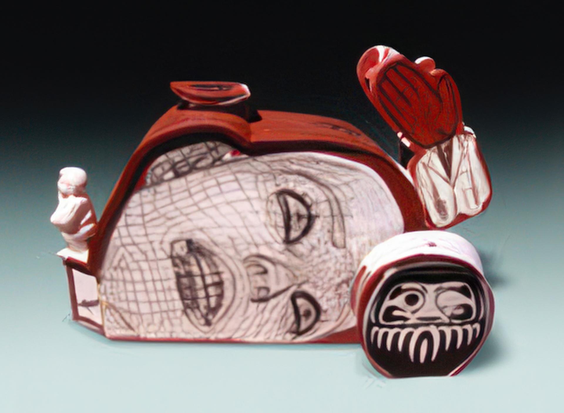 My work represents the next generation of ceramic artists, who fuse today’s technology with one of the oldest traditions in art. To some, the computer is completely foreign, while others have grown up in front of one. During the day, I work as an art director at a Chicago advertising agency. I use the computer to create a myriad of advertising elements. While at work, I am exposed to programs and media that have direct applications for our clients. But in the back of my mind, I am wondering how can I apply this to my artwork, and when I get home, it is not long before I am situated in front of the computer again. I like to make work that makes people think. Because much of my work deals with personal things in my life, I often use a complex layering of semiotics to convey the meaning. The basic idea sits on the surface, with successive levels buried in symbolism. I give clues to viewers and let them unravel the mystery. I think the role of art is to convey or evoke emotion, and I hope all of my work succeeds on this level. Technical Overview I use the computer in my artwork to illustrate, manipulate, and compose the elements for each piece. It allows me to create several versions of a concept while refining it along the way until there is a version that successfully conveys my vision. Once the concept is complete, I send my computer files out for film positives. I use the film separations to create silkscreens used in transferring the images onto large sheets of wet clay. The process can take several hours and is rather delicate, as the clay is quite soft and records every push and pull. One accidental slip can ruin a piece. My printing medium is glaze and not ink, which presents all sorts of challenges and contributes to the lengthy process. I like to work wet on wet as it gives me freedom. I can emboss a cardboard trompe l’oeil affect on the surface of the clay and fool people into thinking it’s cardboard and not clay. Once the printing is complete, I often give additional volume to the work, so it pops off a wall when it is hung in place. Once the imagery and clay are free of moisture, the work is placed in a kiln and fired. The once-delicate imagery is now permantly fixed to the clay body to stand the test of time.