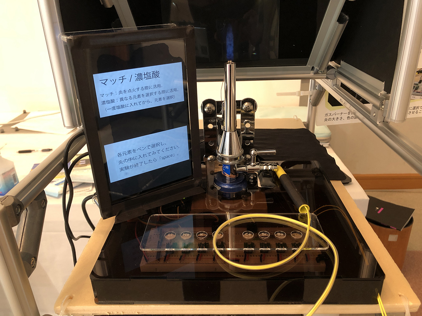 The HoloBurner system is a mixed reality instrument for chemistry experiments to learn about the color reaction of flames. The system consists of a real Bunsen burner and an aerial image display that shows a holographic image of a flame at the tip of the burner.