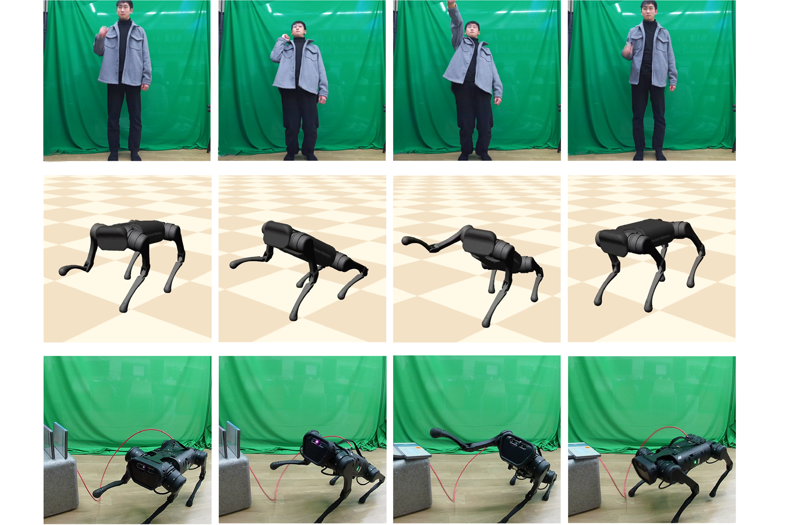 Robotic creatures are capable of entering hazardous environments instead of human workers, but it is challenging to develop a fully autonomous agent that can work independently in unstructured scenes. We propose a human motion-based control interface for quadrupedal robots that promises adaptable robot operations by reflecting the user’s intuition directly to the robot’s movements. Designing motion interface for different morphologies conveys tricky problems in solving dynamics and control strategies. We first retarget the captured human motion into the corresponding robot’s kinematic space with proper semantics using supervised learning and post-processing techniques. Second, we build the motion imitation controller to track the given retargeted motion using deep reinforcement learning with task-based curriculums. Finally, we apply domain randomization during training for real-world deployment. (Video1)