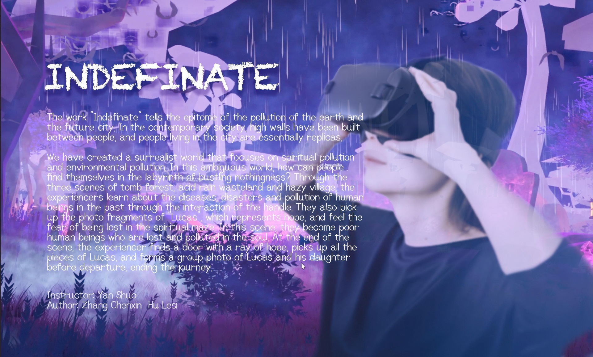 The work “Indefinitely” tells the epitome of the pollution of the earth and the future city. In the contemporary society, high walls have been built between people, and people living in the city are essentially replicas. We have created a surrealist world that focuses on spiritual pollution and environmental pollution. In this ambiguous world, how can people find themselves in the labyrinth of bustling nothingness? Through the three scenes of tomb forest, acid rain wasteland and hazy village, the experiencers learn about the diseases, disasters and pollution of human beings in the past through the interaction of the handle. They also pick up the photo fragments of “Lucas”, which represents hope, and feel the fear of being lost in the spiritual maze. In this scene, they become poor human beings who are lost and polluted in the soul. At the end of the scene, the experiencer finds a door with a ray of hope, picks up all the pieces of Lucas, and forms a group photo of Lucas and his daughter before departure, ending the journey.