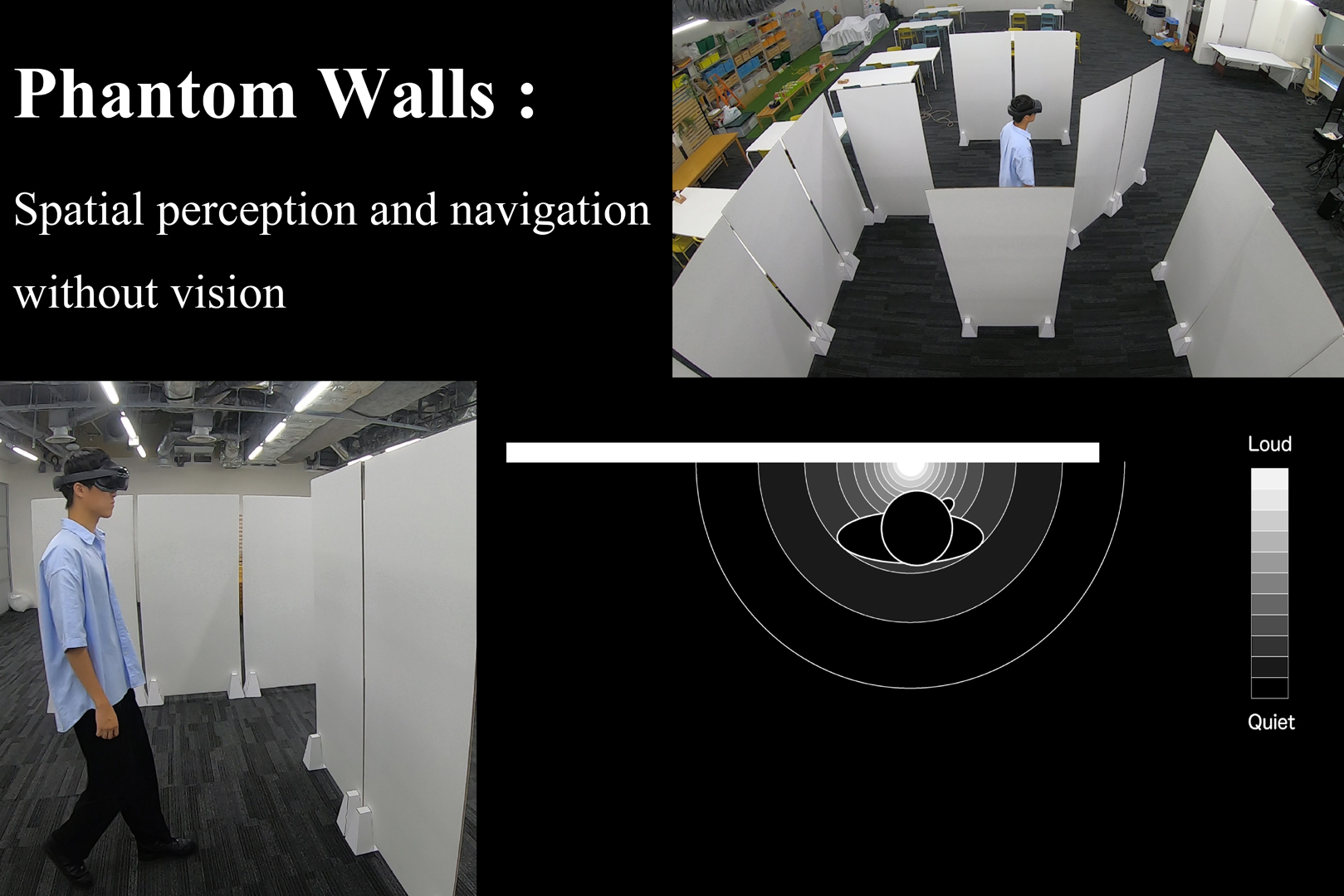 “Phantom Walls” is a novel technique that establishes continuous spatial perception without vision. By creating an auditory environment where obstacles emit sounds, users can perceive and navigate around visually imperceptible “Phantom” obstacles by listening to the generated “soundscapes”. This method allows individuals to perceive and avoid these obstacles while walking without vision.