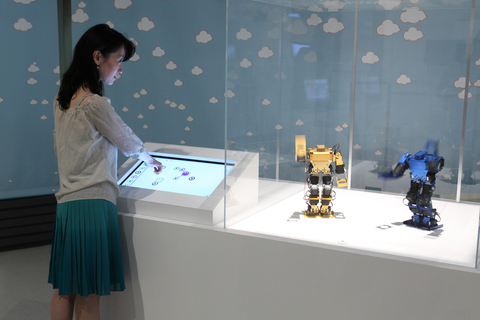 RoboJockey is an interface for creating robot behavior and giving people a new entertainment experience with robots, in particular, making robots dance, such as the “Disc jockey” and “Video jockey” (Figure 1, left). The users can create continuous robot dance behaviors on the interface by using a simple visual language (Figure 1, right). The system generates music with beat and choreographs the robots in a dance using user-created behaviors. The RoboJockey has a multi-touch tabletop interface, which gives users a multi-user collaboration; every object is designed as a circle, and it can be operated from all positions around the tabletop interface. RoboJockey supports a humanoid robot, which has a capable of expressing human like dance behaviors (Figure 1, center).