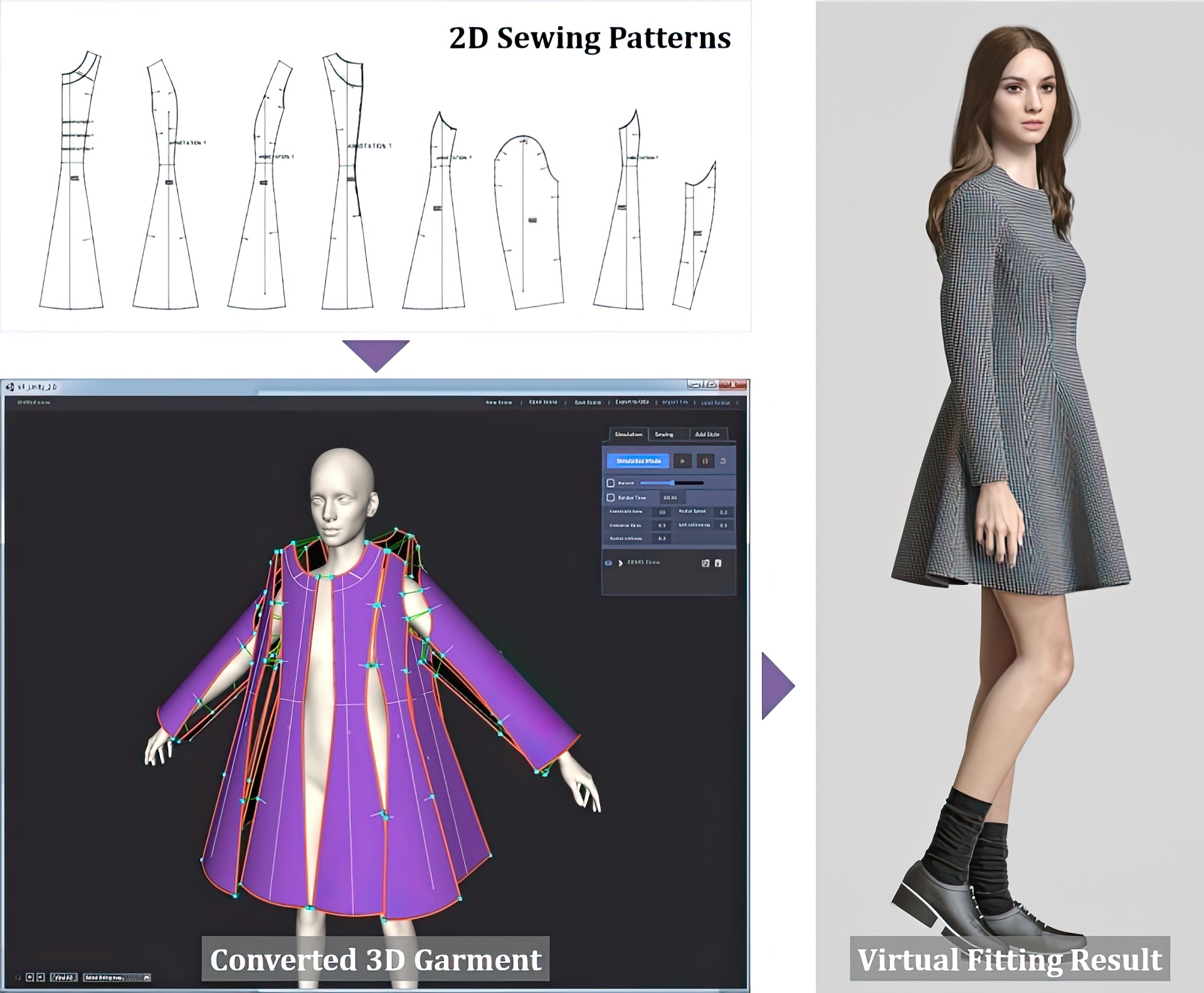 This semi-automatic garment converting system generates 3D garment data for physics-based cloth simulation from 2D sewing patterns. The easy-to-use system reduces conversion time and provides optimal 3D garment data for realistic garment simulation.