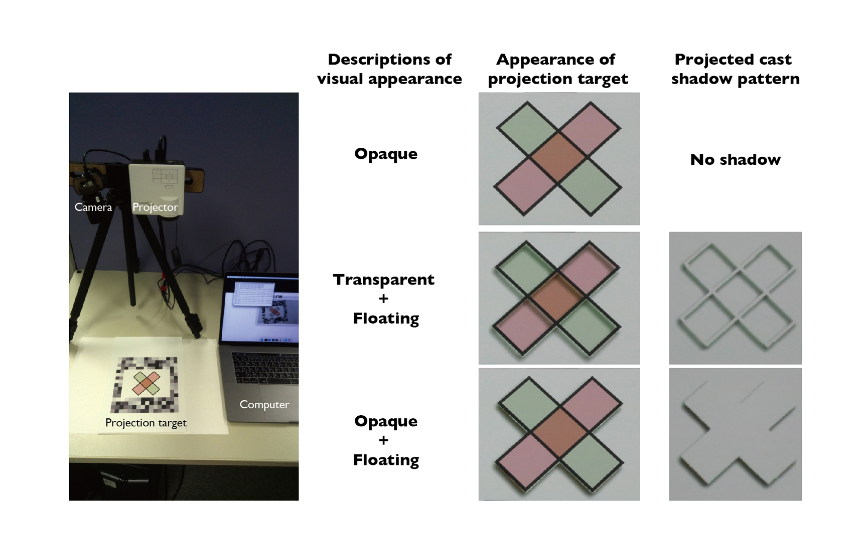 The purpose of this installation is to demonstrate novel perceptual effects in which the compelling illusion of depth and transparency for paper materials is induced by the conventional light projection of cast shadow patterns. The audience can interactively enjoy experiences wherein objects and letters on a paper perceptually float up.