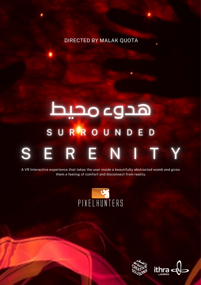 Surrounded Serenity” is an experience that ensconces the users in a world of awe and amusement. It is a story that we all know, yet do not know at the same time and virtual reality is a great medium to convey that experience. The experience is for everyone and is a creative and artistic approach to the visual representation of the world inside the womb. The aim is to create a sense of calm and play that can alleviate some anxiety. The user will be able to experience the visual and auditory experience of being inside the womb. The user can also interact with symbolic elements that represent all five senses, along with haptics that provide a sense of physical touch. It is an interactive journey that offers a space of serenity, play, and emotional comfort.