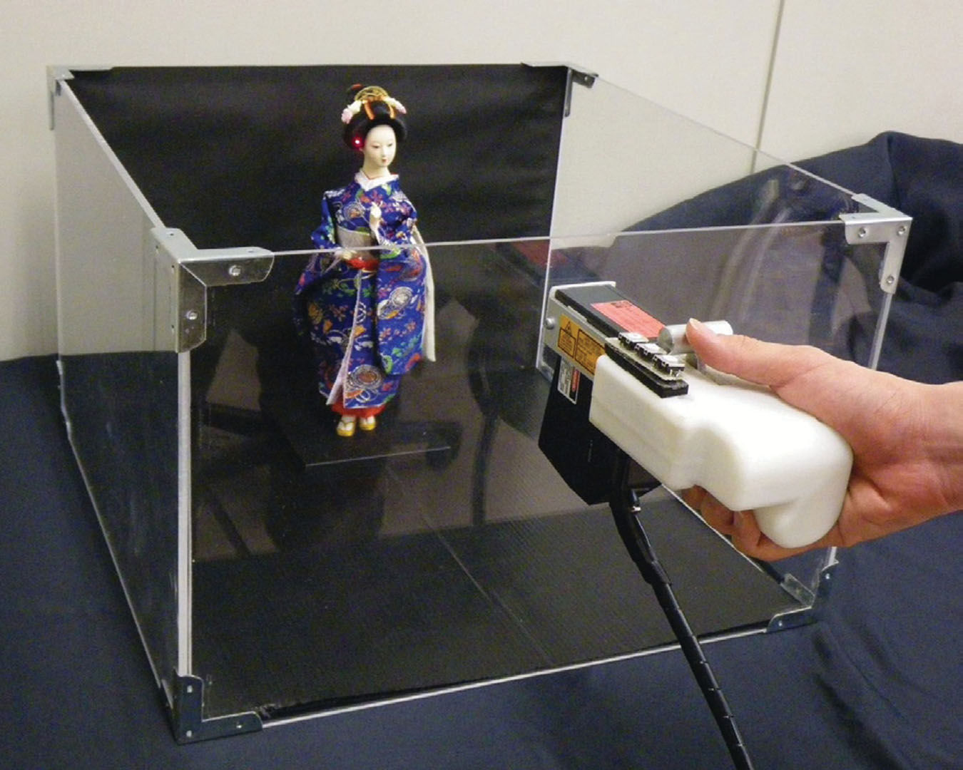 This prototype system employs a laser range finder to determine the distance to a given object. Users can feel the shape of the object in real time even though it exists inside a glass case.