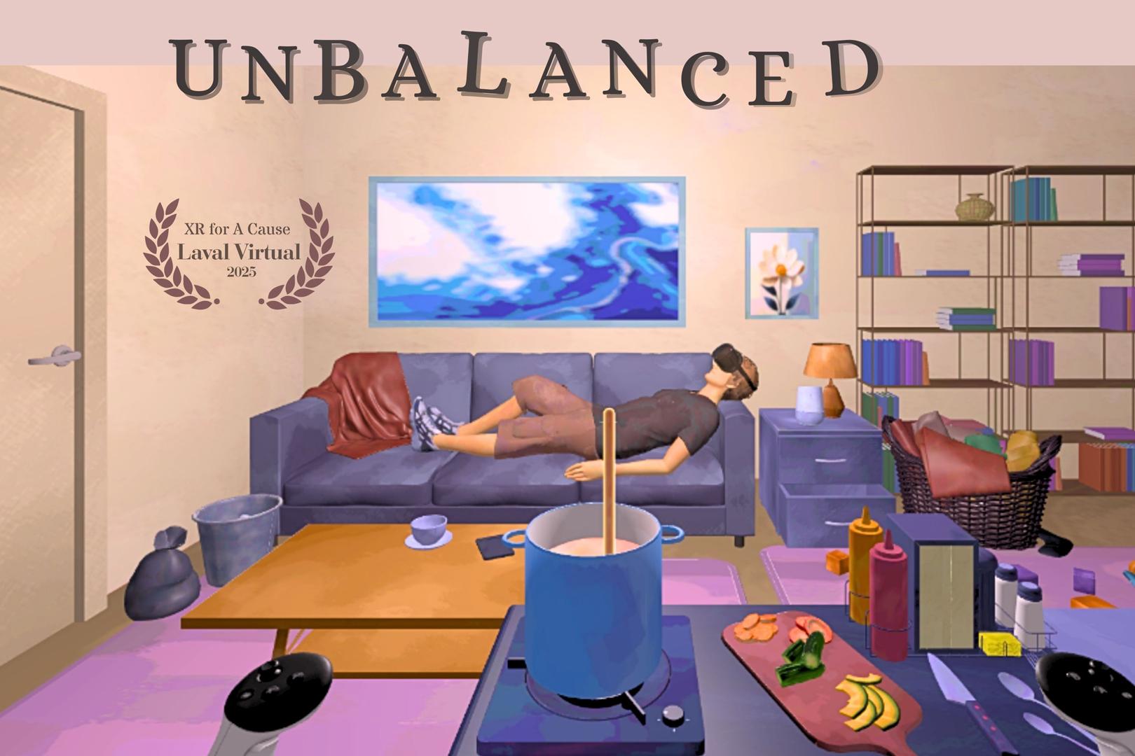 “Unbalanced” is an immersive VR simulation that places users in the role of a working mother managing the overlapping demands of childcare, housework, and professional obligations. It reveals the emotional and cognitive toll of caregiving, and the unrecognized caregiving effort that contributes to work-life imbalance. Through real-time stressors—such as a crying infant and time-sensitive household demands—combined with haptic and auditory feedback, the system creates an emotionally charged and physically responsive environment. Users confront the pressures and constant task-switching that define many women’s daily lives, offering both challenge and immersion through play. Endorsed by educators and awarded by Laval Virtual, the project demonstrates how multisensory VR can support inclusive education and public engagement. “︁Unbalanced”︁ offers an innovative approach to express care work and gender equity issues through experiential storytelling, highlighting how immersive technologies can expand the emotional and social dimensions of interactive media.