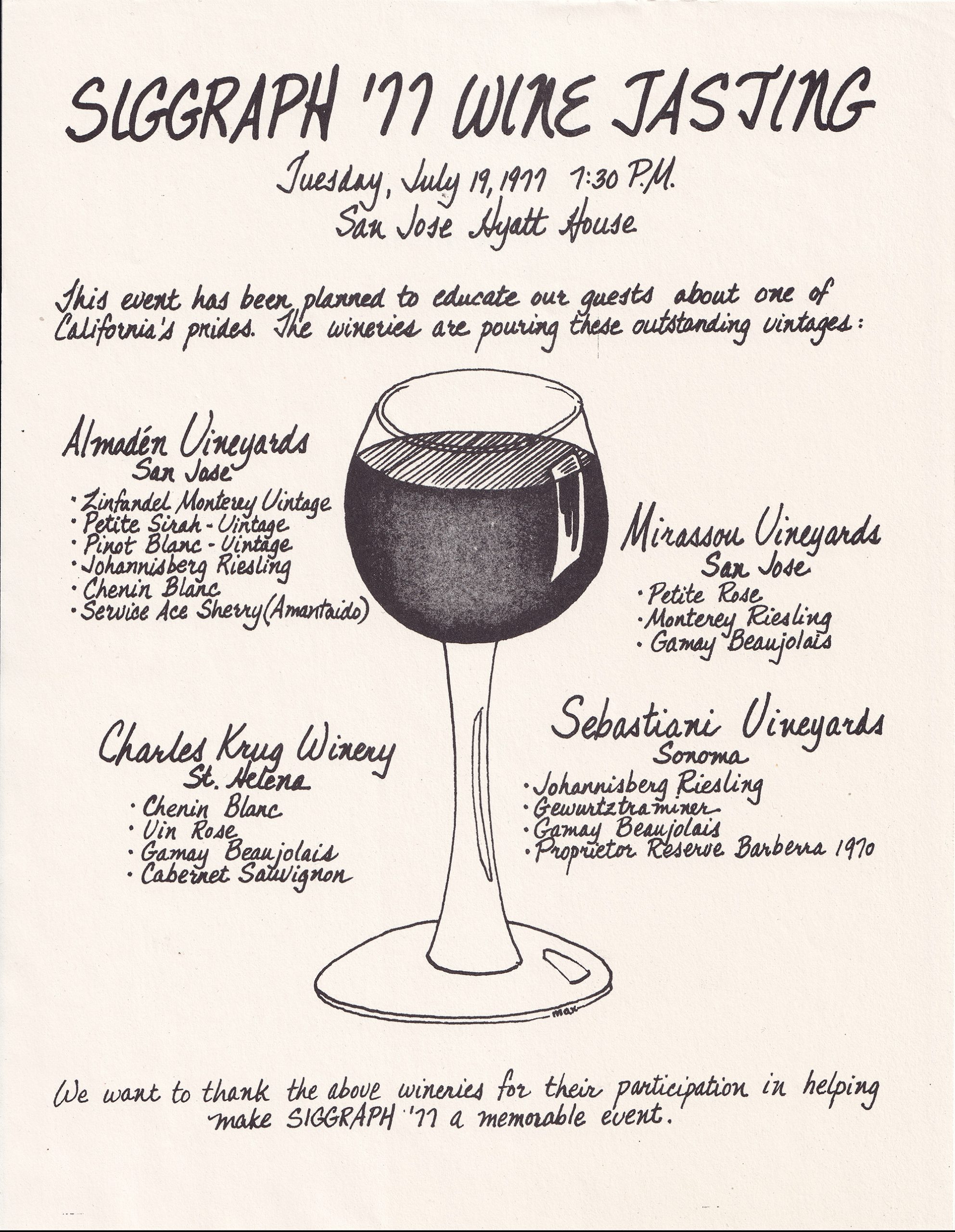When told that California is having a drought, the Queen exclaimed, “Let them drink wine!” And so we shall, as one should not visit California without sampling the yields of a selected few of our local wineries. Plan to be on hand for the Tuesday evening bacchanal!