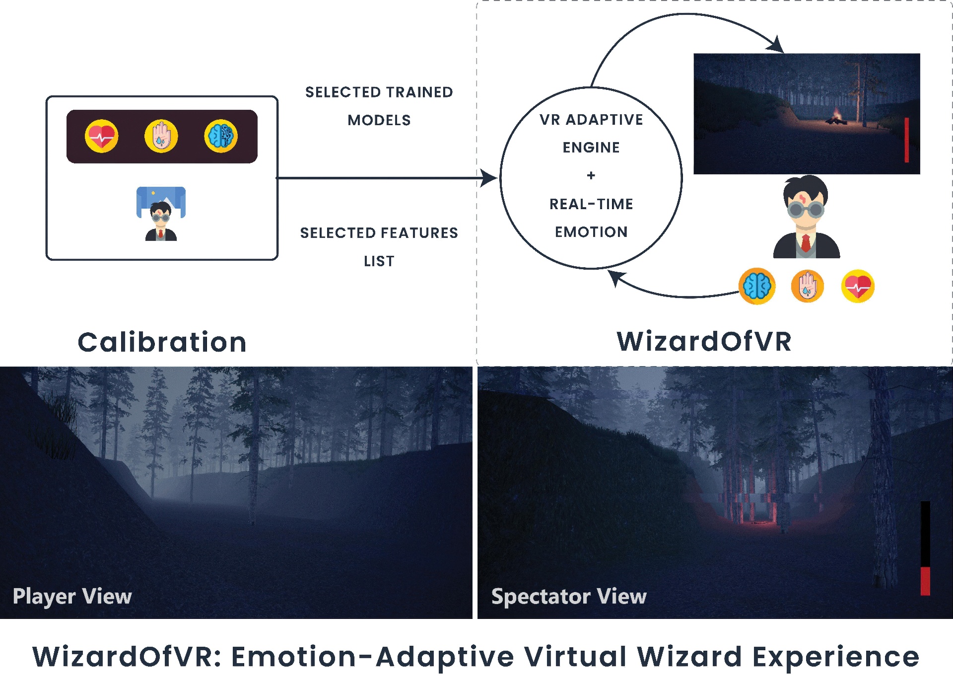 We demonstrate WizardOfVR, a personalized emotion-adaptive virtual reality (VR) Wizard akin to the Harry Potter experience, highlighting a use-case scenario of a real-time biofeedback loop between the user’s emotional state and adaptive VR environments (VREs) using off-the-shelf physiological sensors. In our demo, the user initially trains the system with a calibration process using physiological signals such as Electroencephalogram (EEG), Electrodermal Activity (EDA), and Heart Rate Variability (HRV). After calibration, they will indulge in a Harry Potter Series’s Forbidden Forest-like experience with adapting environmental factors based on ‘SanityMeter’ indicating the user’s real-time emotional states. The overall goal of this demo is to provide more balanced, immersive, and optimal emotional virtual experiences.