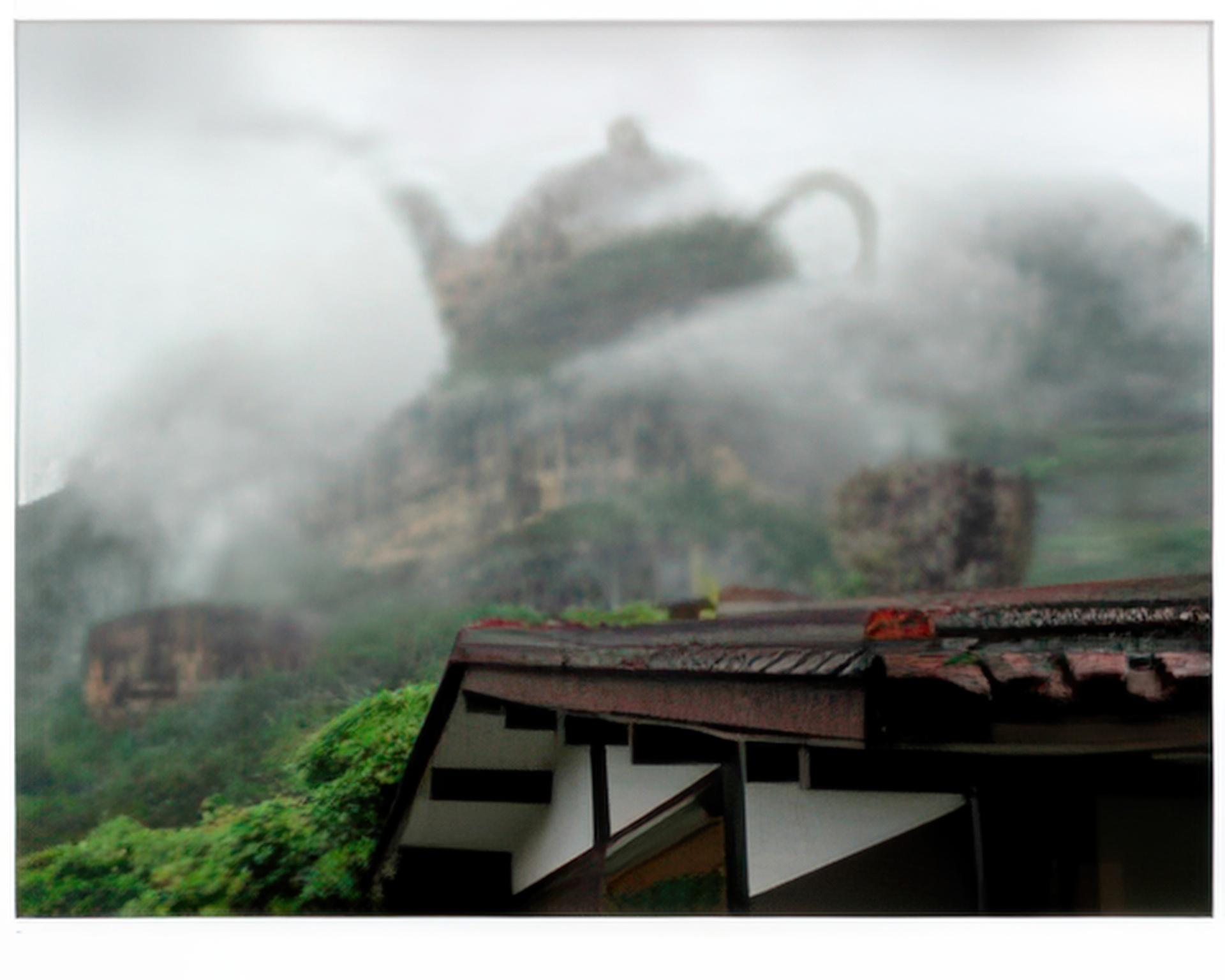 In the spring of 2001, my wife and I were invited to participate in a tea tour that took us to regions of China that are famous for producing tea. When I arrived in Wuyi Shan, I was overwhelmed by the beauty of the landscape of the Wuyi Mountains, the peaks shrouded in mist, and in my mind, I could see all kinds of fantastic shapes. It was just so rich in atmosphere. As I took photographs of these mountains, I knew, as a surrealist, that I wanted to show steaming teapots and tea cups in the mist. When I arrived home, I downloaded my pictures, and I was able to produce these images by enhancing the shapes on the computer, creating “surrealistic photographs.” I strived to preserve the realism of these photographs using special effects to recreate what I had seen in my mind. On this tea tour, I was learning new things about tea and how it came to be. We visited a teapot factory in Yixing, particpated in tea ceremonies, and traveled to nearby regions to see tea farms and tea factories. I was strongly impressed by the way tea affects so many aspects of life and nature. The elements (earth, air, water, and fire) all relate back to tea and are crucial to each stage of growth, oxidation, and steeping. It’s no wonder that the resulting drink nourishes our bodies as well as our souls. I wanted to show how these elements of nature served as strong inspiration for these pictures. People often ask me the same question about the Wuyi Mountains: Do they really look like that? I always reply: Yes, they do. In my mind, that was how I saw the mountains, with all those shapes in the landscapes. Relatively very little manipulation was needed for the finished images. The landscape itself was very suggestive. So these questions convince me that I succeeded in creating the effect I wanted. The photographs were taken in April 2001. I created the series of images in August 2002 in preparation for an art exhibit at Tea-Tray in the Sky in Arlington, Massachusetts the following month Technical Overview The Wuyi Mountains Series was published as a set of 12 prints in a box set. The photographs have been exhibited throughout the United States and have been seen in Tea, A Magazine. The photographs were shot with a Nikon Coolpix 800 digitial camera. After the photographs were downloaded to a Mac G4, 12 photographs were selected and taken into Adobe Photoshop to be manipulated: erasing portions of the photograph, cutting and pasting elements within the compostion, and air-brushing were all used to create the effects you see in this series. Once the images were completed, they were printed on an Epson 1270 Photo Printer.