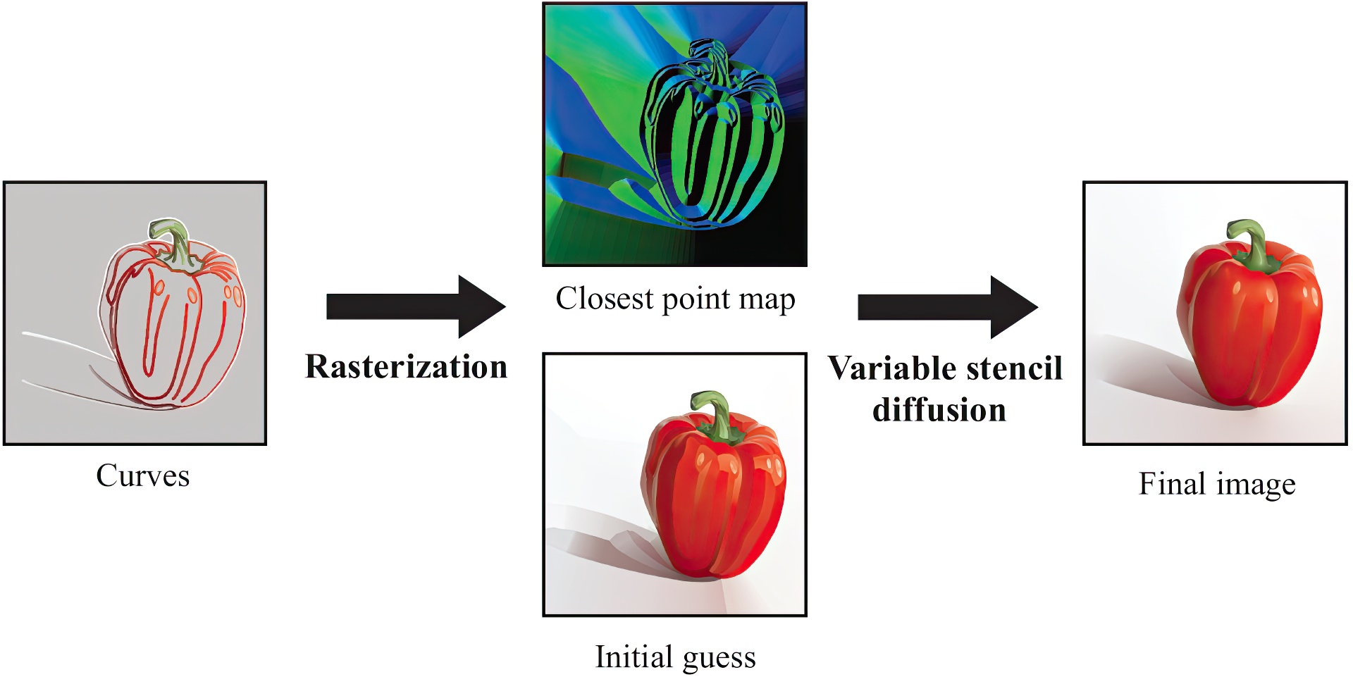 12. Orzan, A., Bousseau, A., Winnemöller, H., Barla, P., Thollot, J., and Salesin, D. 2008. Diffusion curves: A vector representation for smooth-shaded images. In ACM Trans. Graph. (SIGGRAPH 2008), vol. 27, Article 92. Google ScholarDigital Library