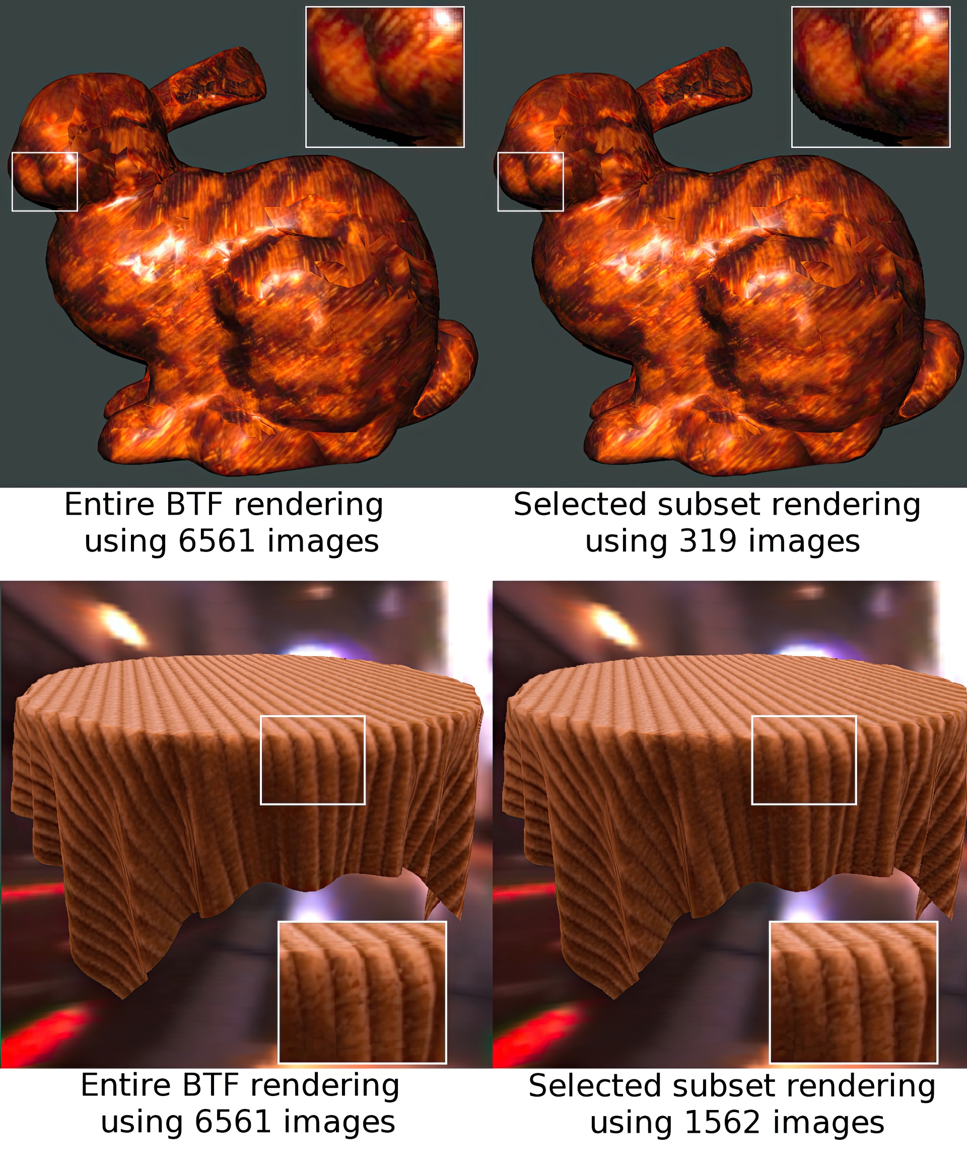 Bidirectional Texture Functions (BTF) are commonly thought to provide the most realistic perceptual experience of materials from rendered images. The key to providing efficient compression of BTFs is the decision as to how much of the data should be preserved. We use psychophysical experiments to show that this decision depends critically upon the material concerned. Furthermore, we develop a BTF derived metric that enables us to automatically set a material’s compression parameters in such a way as to provide users with a predefined perceptual quality. We investigate the correlation of three different BTF metrics with psychophysically derived data. Eight materials were presented to eleven naive observers who were asked to judge the perceived quality of BTF renderings as the amount of preserved data was varied. The metric showing the highest correlation with the thresholds set by the observers was the mean variance of individual BTF images. This metric was then used to automatically determine the material-specific compression parameters used in a vector quantisation scheme. The results were successfully validated in an experiment with six additional materials and eighteen observers. We show that using the psychophysically reduced BTF data significantly improves performance of a PCA-based compression method. On average, we were able to increase the compression ratios, and decrease processing times, by a factor of four without any differences being perceived.