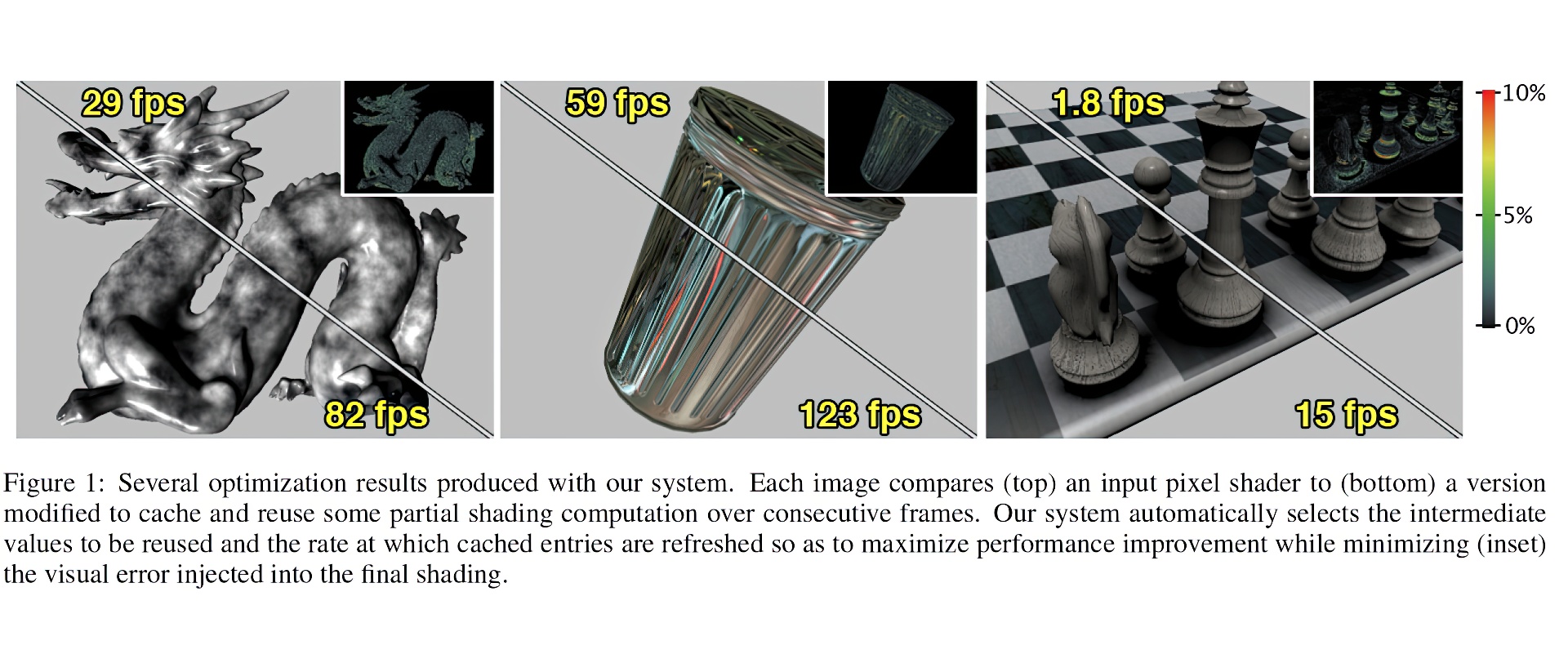 We present a framework and supporting algorithms to automate the use of temporal data reprojection as a general tool for optimizing procedural shaders. Although the general strategy of caching and reusing expensive intermediate shading calculations across consecutive frames has previously been shown to provide an effective trade-off between speed and accuracy, the critical choices of what to reuse and at what rate to refresh cached entries have been left to a designer. The fact that these decisions require a deep understanding of a procedure’s semantic structure makes it challenging to select optimal candidates among possibly hundreds of alternatives. Our automated approach relies on parametric models of the way possible caching decisions affect the shader’s performance and visual fidelity. These models are trained using a sample rendering session and drive an interactive profiler in which the user can explore the error/performance trade-offs associated with incorporating temporal reprojection. We evaluate the proposed models and selection algorithm with a prototype system used to optimize several complex shaders and compare our approach to current alternatives.