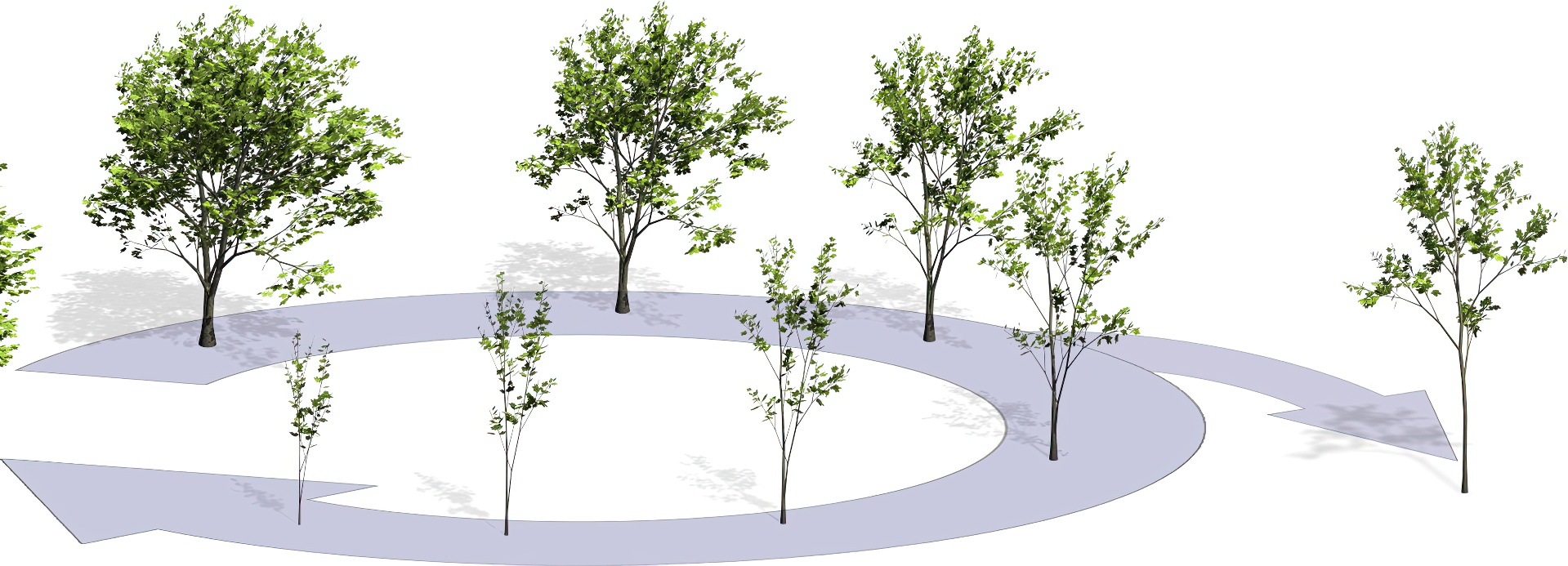 Given a static tree model we present a method to compute developmental stages that approximate the tree’s natural growth. The tree model is analyzed and a graph-based description its skeleton is determined. Based on structural similarity, branches are added where pruning has been applied or branches have died off over time. Botanic growth models and allometric rules enable us to produce convincing animations from a young tree that converge to the given model. Furthermore, the user can explore all intermediate stages. By selectively applying the process to parts of the tree even complex models can be edited easily. This form of reverse engineering enables users to create rich natural scenes from a small number of static tree models.