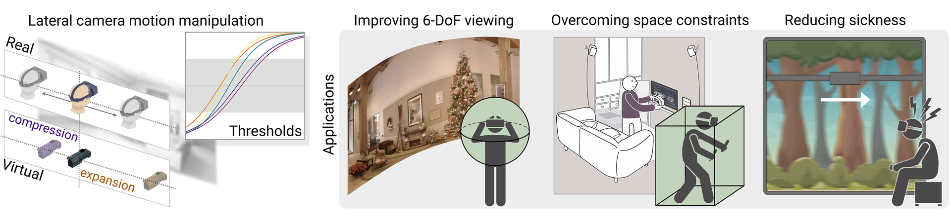 Virtual Reality (VR) systems increase immersion by reproducing users’ movements in the real world. However, several works have shown that this real-to-virtual mapping does not need to be precise in order to convey a realistic experience. Being able to alter this mapping has many potential applications, since achieving an accurate real-to-virtual mapping is not always possible due to limitations in the capture or display hardware, or in the physical space available. In this work, we measure detection thresholds for lateral translation gains of virtual camera motion in response to the corresponding head motion under natural viewing, and in the absence of locomotion, so that virtual camera movement can be either compressed or expanded while these manipulations remain undetected. Finally, we propose three applications for our method, addressing three key problems in VR: improving 6-DoF viewing for captured 360° footage, overcoming physical constraints, and reducing simulator sickness. We have further validated our thresholds and evaluated our applications by means of additional user studies confirming that our manipulations remain imperceptible, and showing that (i) compressing virtual camera motion reduces visible artifacts in 6-DoF, hence improving perceived quality, (ii) virtual expansion allows for completion of virtual tasks within a reduced physical space, and (iii) simulator sickness may be alleviated in simple scenarios when our compression method is applied.