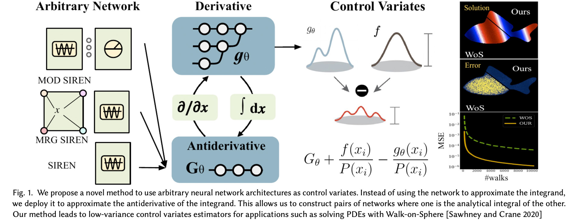 We present a method that uses arbitrary neural network architectures as control variates with automatic differentiation to improve Monte Carlo methods. Our approach creates unbiased, low-variance, and numerically stable Monte Carlo estimators for various problem setups. We demonstrate our method’s advantages in solving Laplace and Poisson equations using Walk-on-Sphere.
