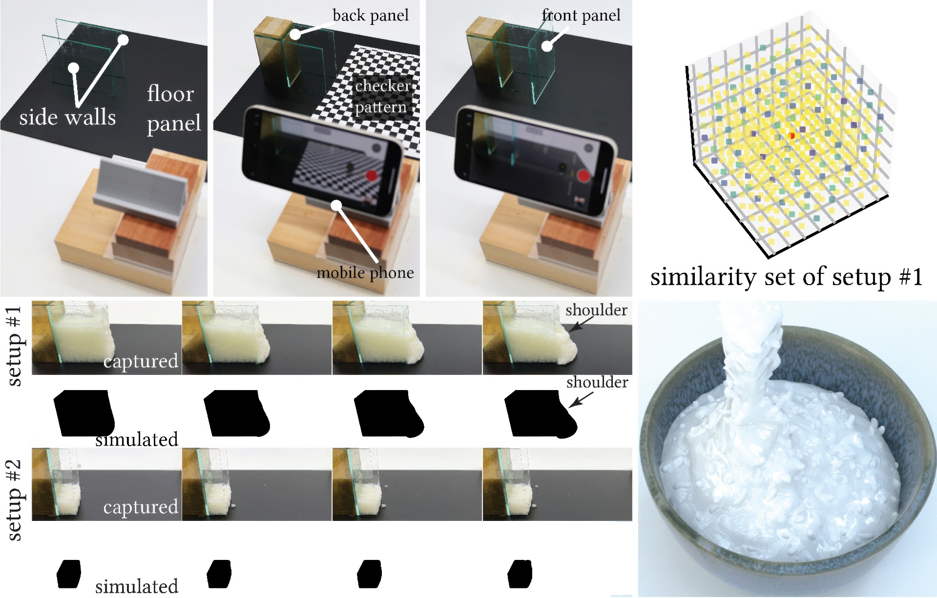 We estimate the three Herschel–Bulkley parameters (yield stress, power law index, and consistency parameter) for shear-dependent fluid-like materials possibly with large-scale inclusions, for which rheometers may fail to provide a useful measurement. We perform experiments using the unknown material for dam-break (or column collapse) setups and capture video footage. We then use simulations to optimize for the material parameters. For better match up with the simple shear flow encountered in a rheometer, we modify the flow rule for the elasto-viscoplastic Herschel–Bulkley model. Analyzing the loss landscape for optimization, we realize a similarity relation; material parameters far away within this relation would result in matched simulations, making it hard to distinguish the parameters. We found that by exploiting the setup dependency of the similarity relation, we can improve on the estimation using multiple setups, which we propose by analyzing the Hessian of the similarity relation. We validate the efficacy of our method by comparing the estimations to the measurements from a rheometer (for materials without large-scale inclusions) and show applications to materials with large-scale inclusions, including various salad or pasta sauces, and congee.