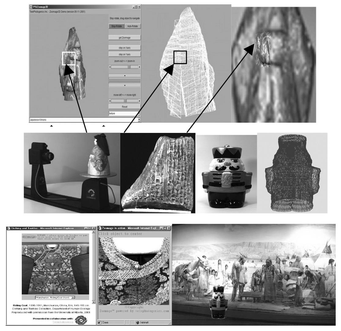 In this report we describe and demonstrate our technology for creating and browsing super high resolution (SHR) & 3D digital content for a variety of applications including museum artifacts and galleries, archeology, anthropology, art design and heritage conservation. SHR 3D images and associated wireframes require large bandwidth to be transmitted in full detail. To address limitations resulting from limited bandwidth, two operations are performed: (i) bandwidth is optimally monitored using a statistical model and (ii) the quality of the 3D objects transmitted are adjusted to best fit the measured bandwidth. Regions of interest (ROIs) specified by users are stored in multiple levels of detail hierarchy. Our approach extends past systems [Martinez et al. 2000] for 2D image browsing, and supports quality of service (QoS) [Vogel et al. 1995] based retrieval. Experimental results demonstrate the feasibility of the proposed approach.